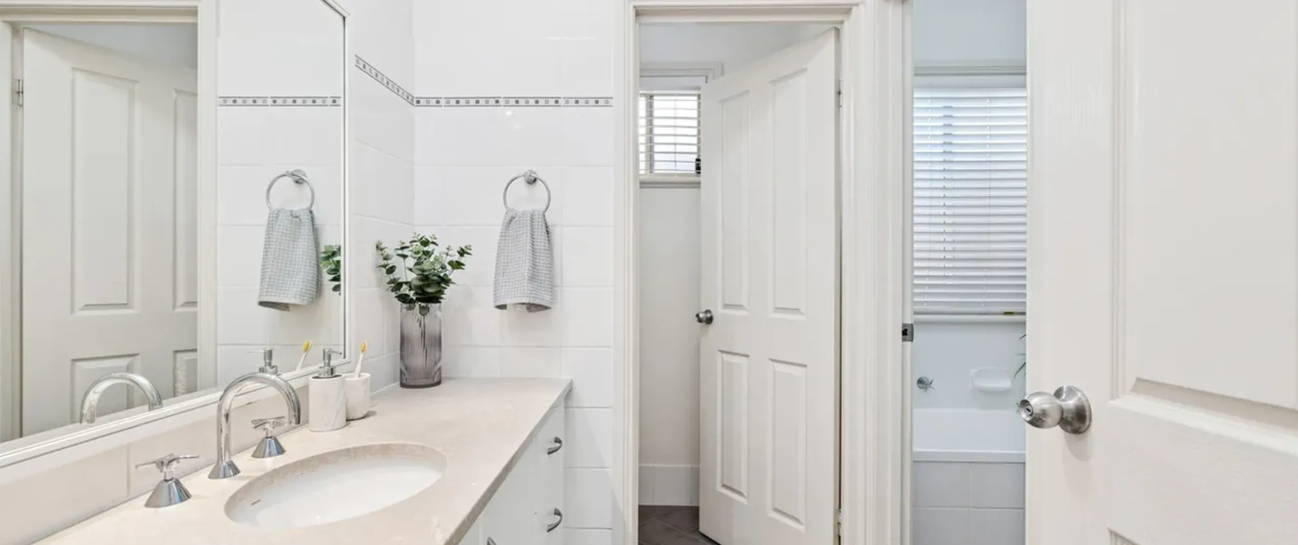 - Three-way bathroom with powder room, bath, shower, and separate toilet