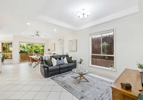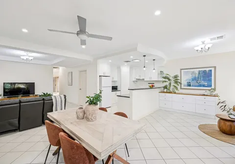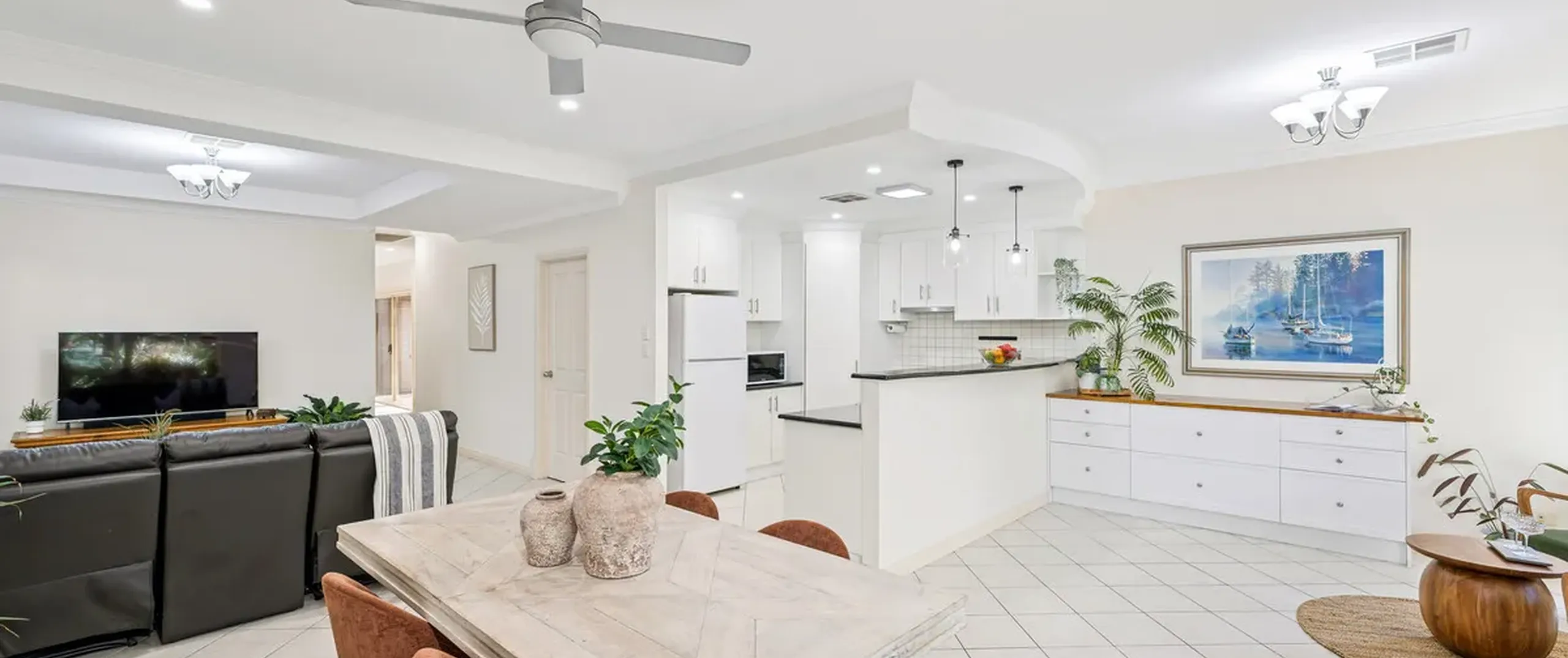 - Open-plan kitchen, living, and dining area with ample natural light and feature bulkhead ceilings