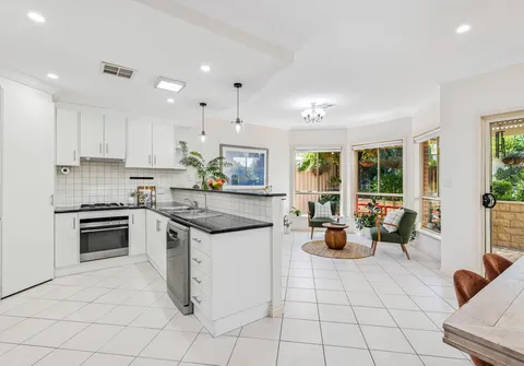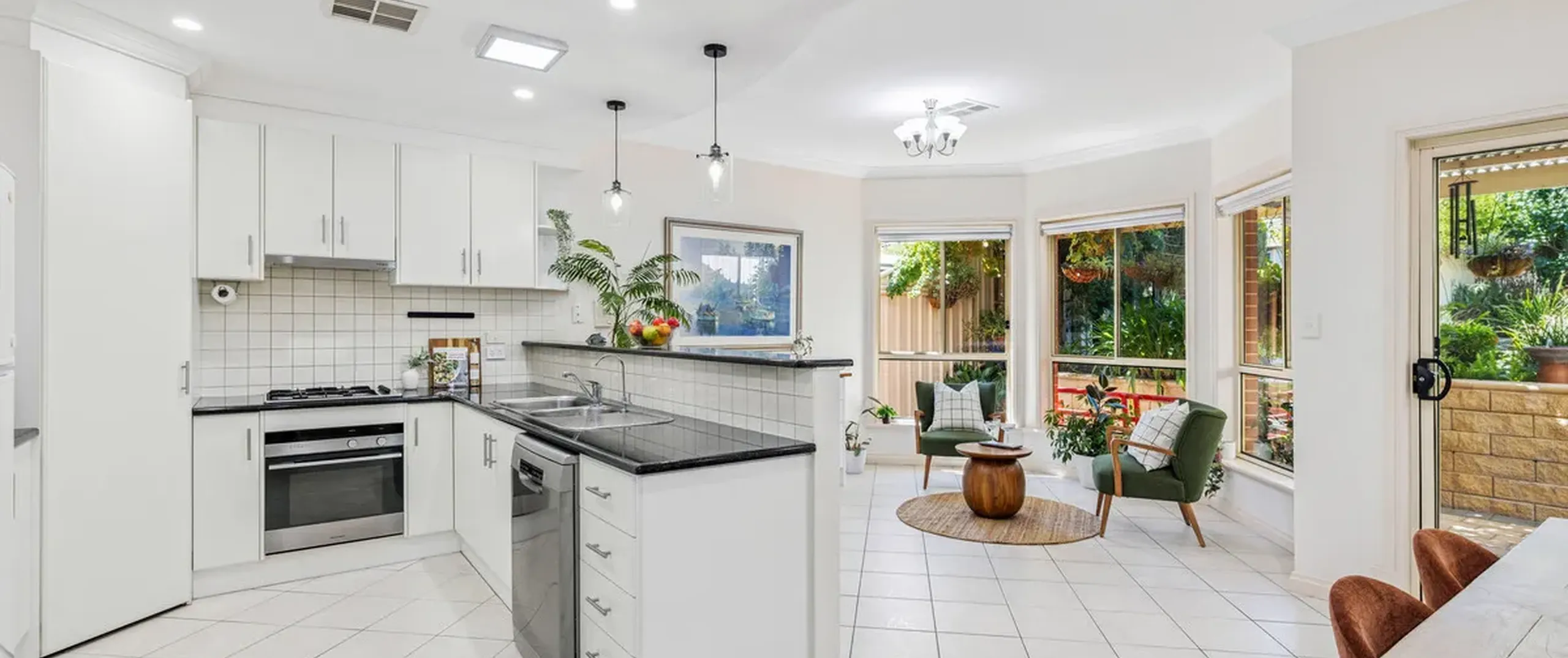 The heart of the home is the stylish, well-appointed kitchen—designed with sleek white cabinetry, a charming bulkhead ceiling, and seamless functionality. Overlooking the open-plan dining and living area, this space is bathed in natural light from multiple windows, creating an inviting and airy ambiance.