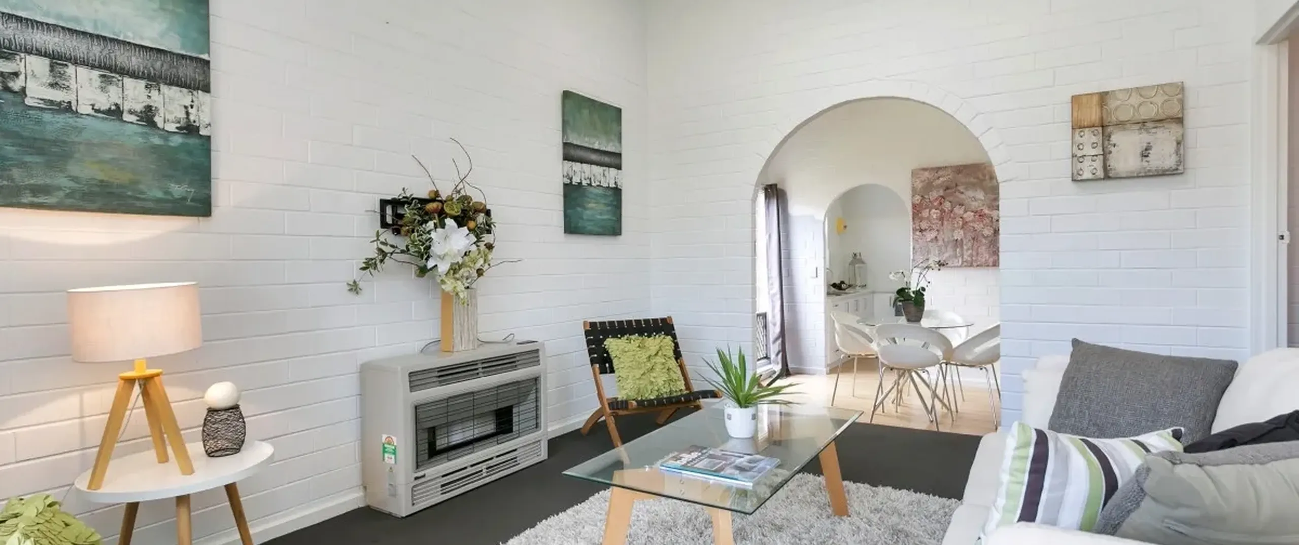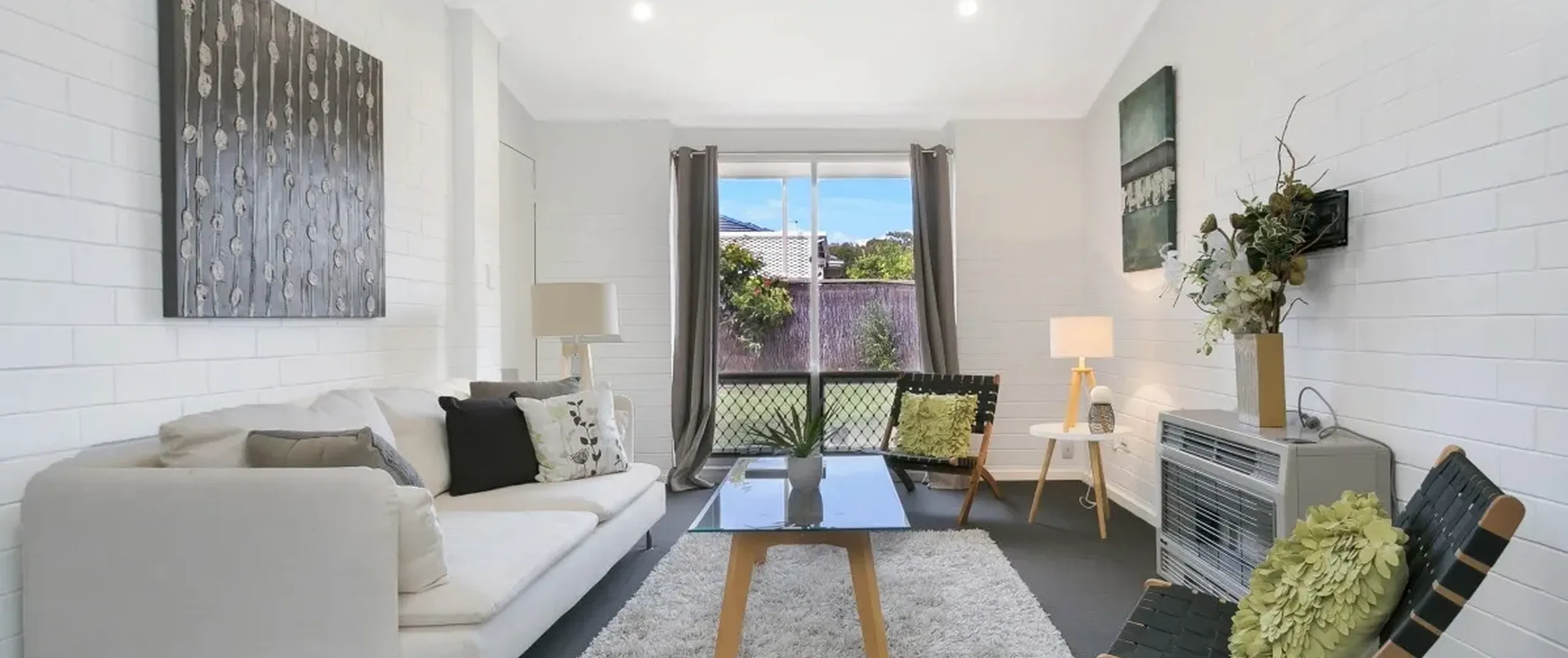 - Light filled living room with gas heater