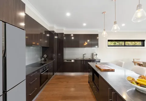 Entertain with ease in the thoughtfully designed living spaces. A cosy lounge room beckons with sliding doors, while an open-plan kitchen, meals, and family room provide the perfect backdrop for gatherings. The kitchen, adorned in moody tones, features high-quality appliances and a breakfast bar crowned with stylish pendant lights, making it a culinary haven for cooking enthusiasts.