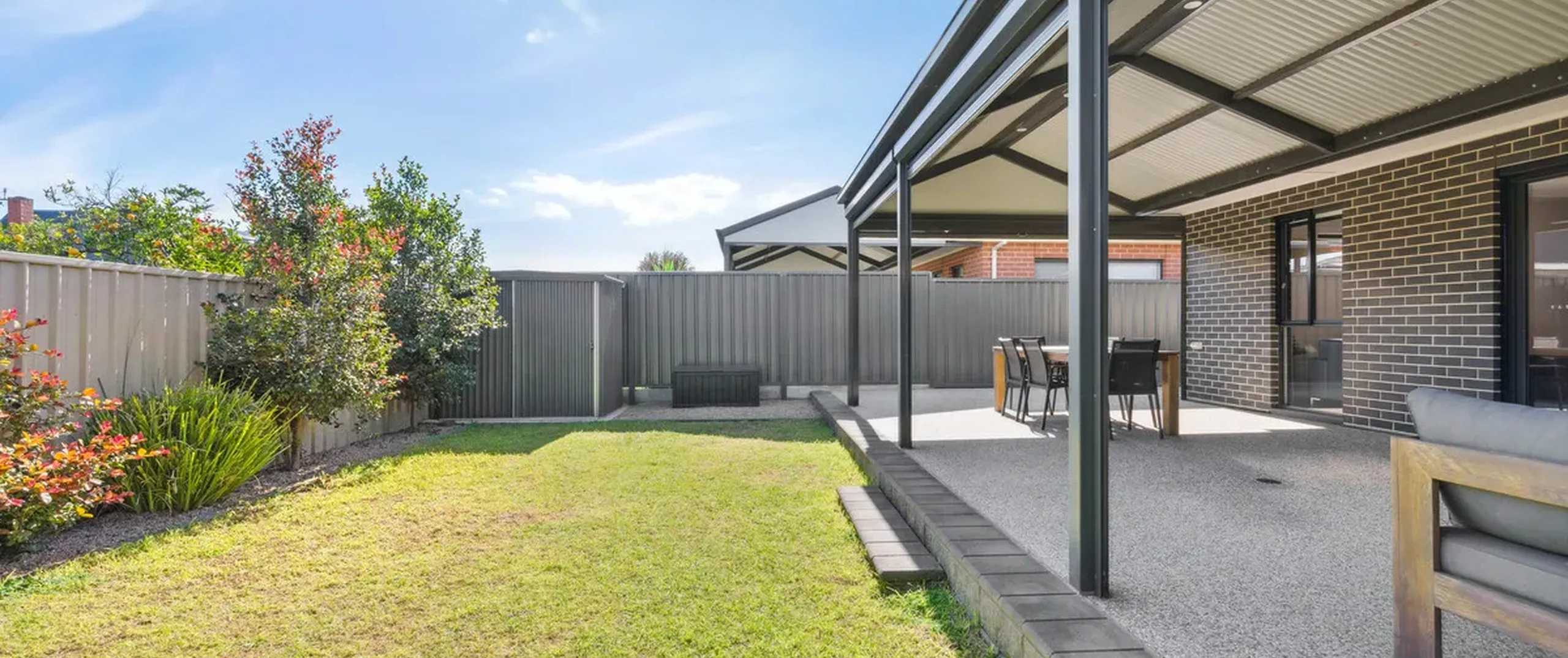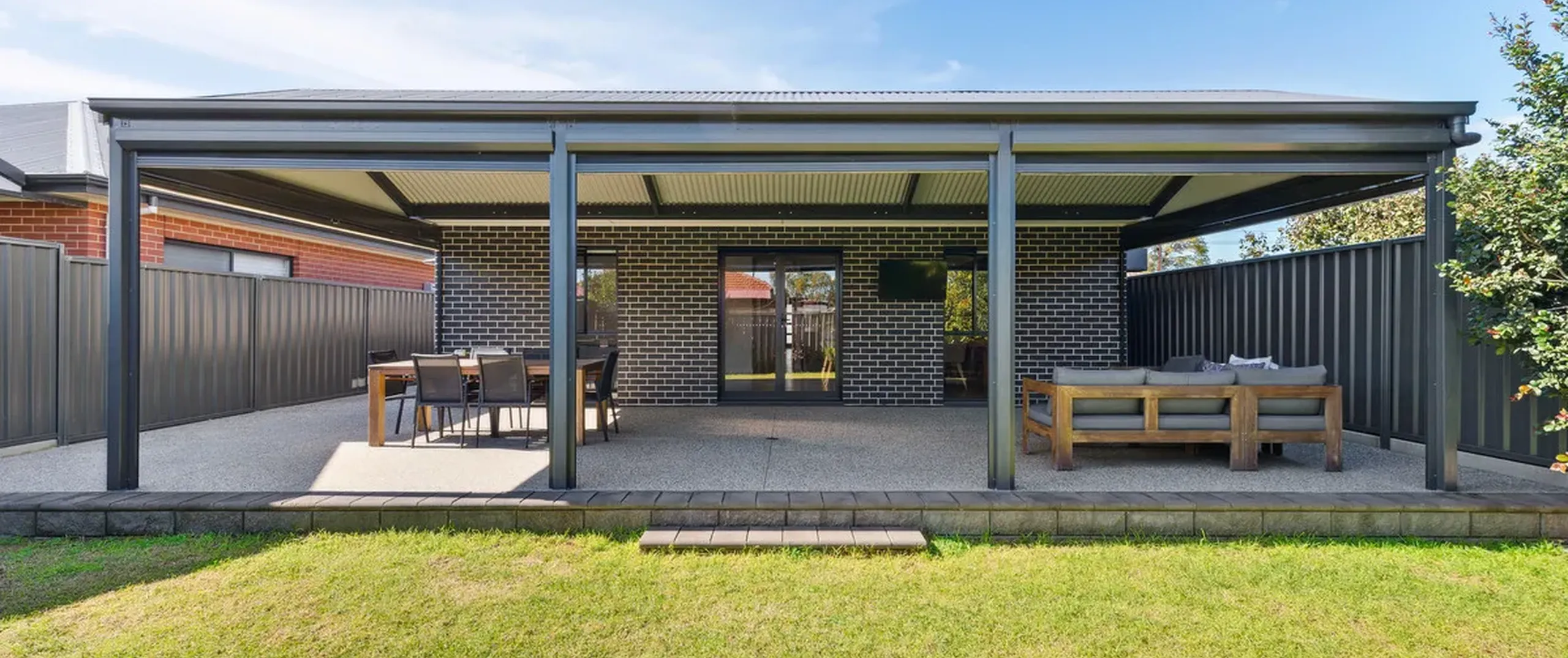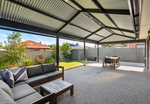 - Outdoor entertaining area with pitched roof pergola featuring exposed aggregate