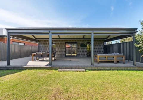 Step outside, where the allure of outdoor living unfolds. An inviting pitched roof pergola creates an enchanting outdoor entertaining area, framed by exposed aggregate concrete and embraced by a meticulously landscaped garden. The harmonious connection between indoor and outdoor spaces ensures a seamless transition for leisure and relaxation.