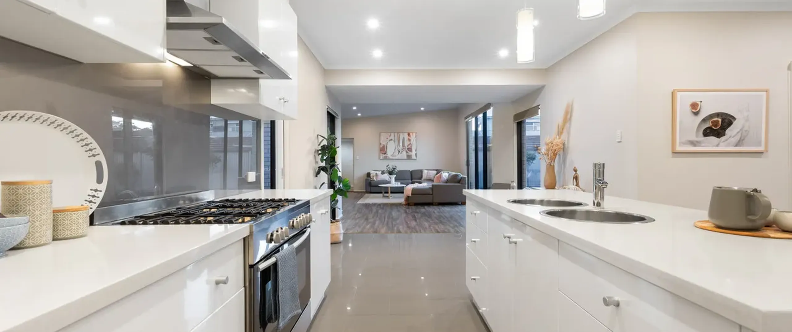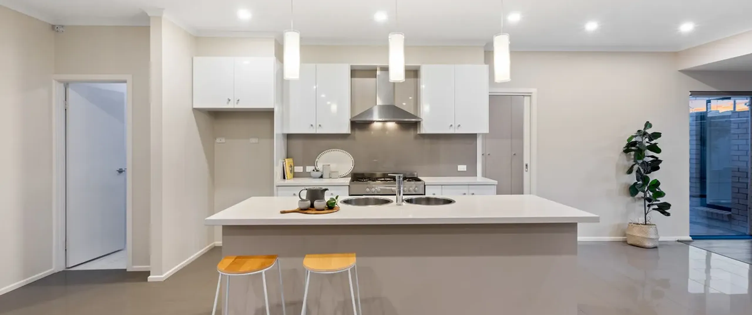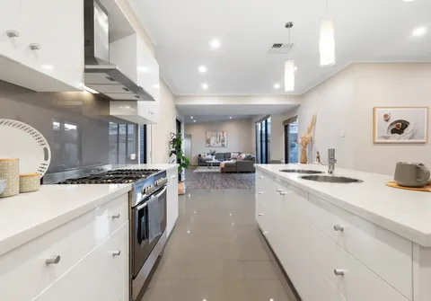 - Stylish kitchen featuring Basmati Essa Stone breakfast bar with double sinks, walk-in pantry, ample cupboard and bench space, butler’s pantry and stainless steel appliances including 5 burner gas electric oven