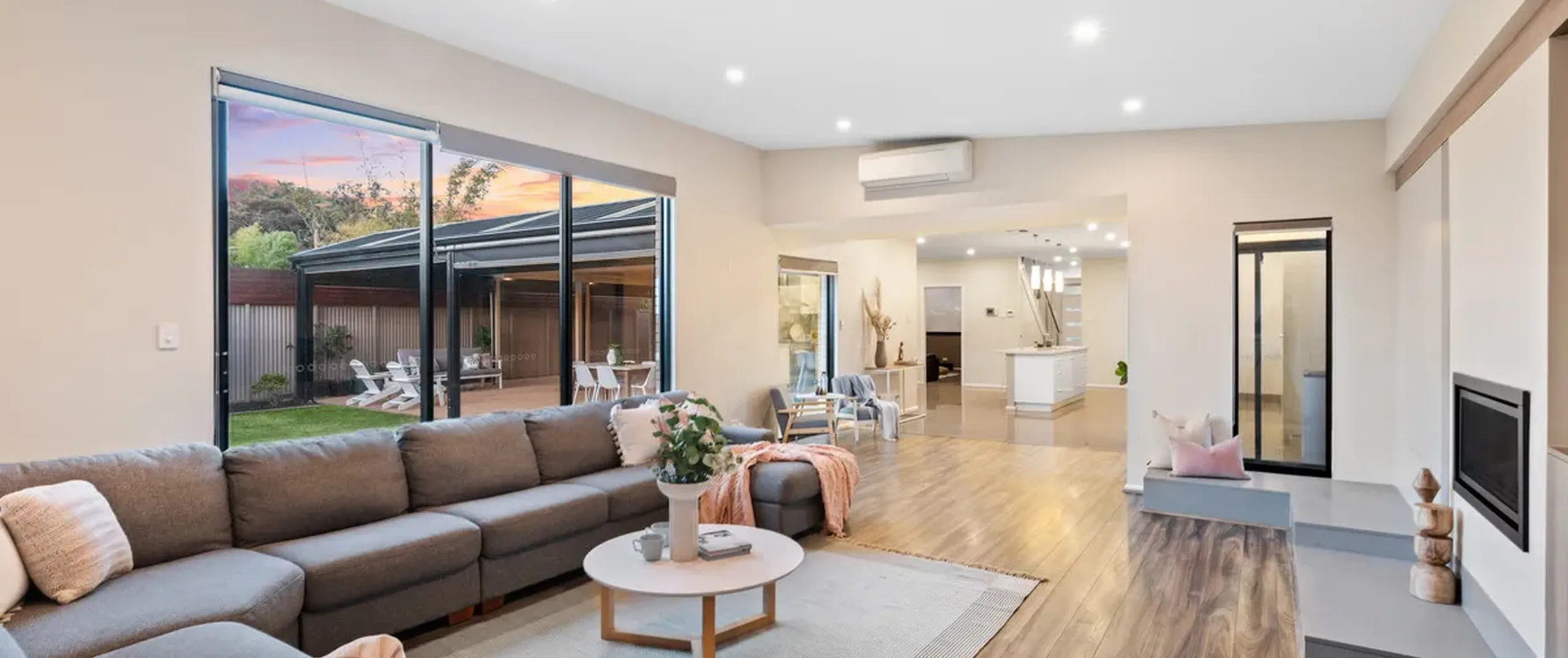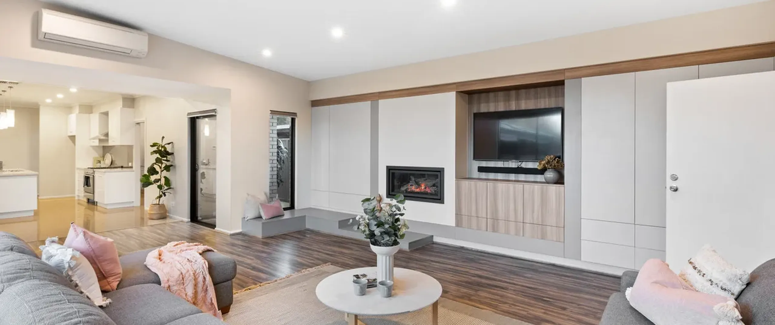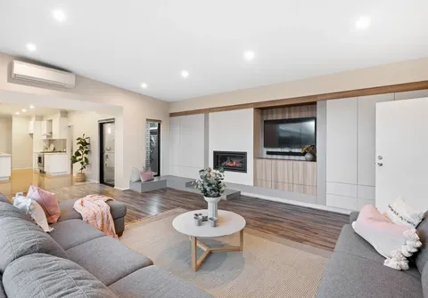 - Expansive lounge room boasting plenty of space, a gas fireplace, linen cupboards, TV niche and sliding door to backyard