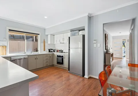 Step inside to find modern, open-plan living area, featuring 2.7-meter-high ceilings and on-trend timber laminate flooring. The timeless kitchen boasts a gas cooktop, oven, range hood, and dishwasher, ensuring both functionality and elegance. The seamless flow from the living room to the rear yard, complete with an undercover patio area, creates a private and secure space, perfect for BBQs and outdoor entertaining.
