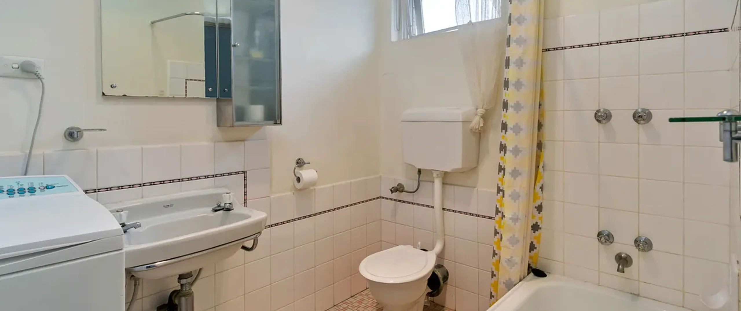 - Bathroom with bath and shower, incorporating laundry