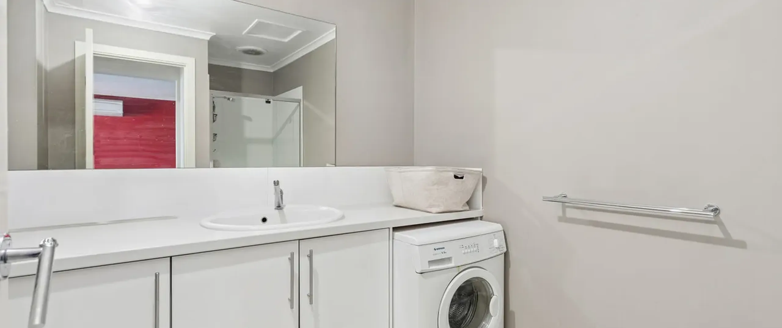 - Bathroom with shower, vanity, toilet, and laundry provisions