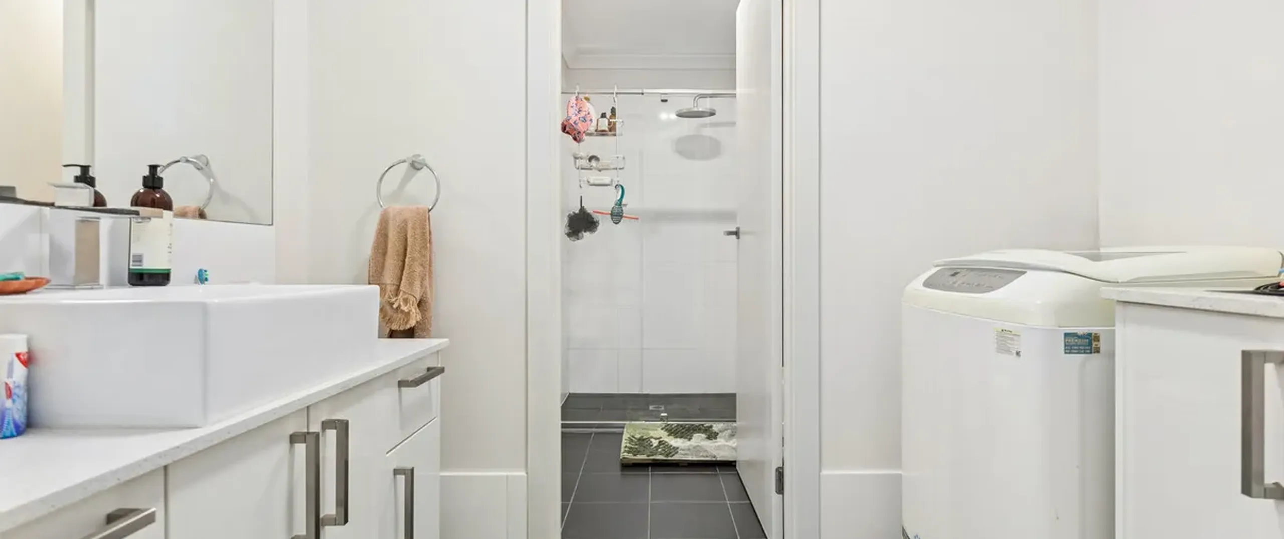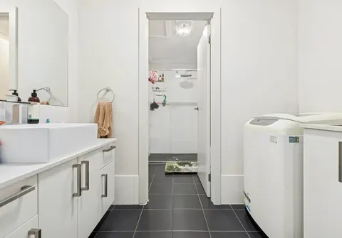 - Centrally positioned main bathroom complete with an oversized shower, toilet, above-mount vanity and integrated laundry facilities