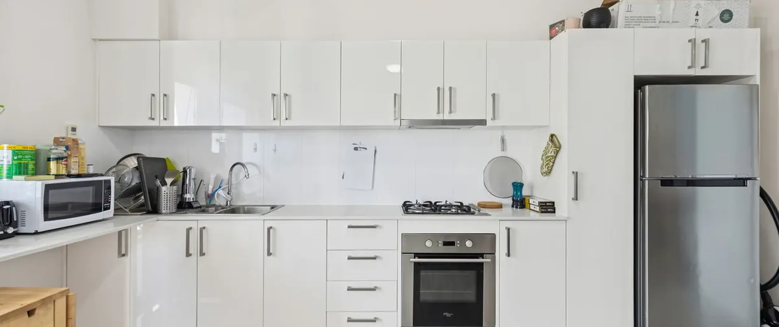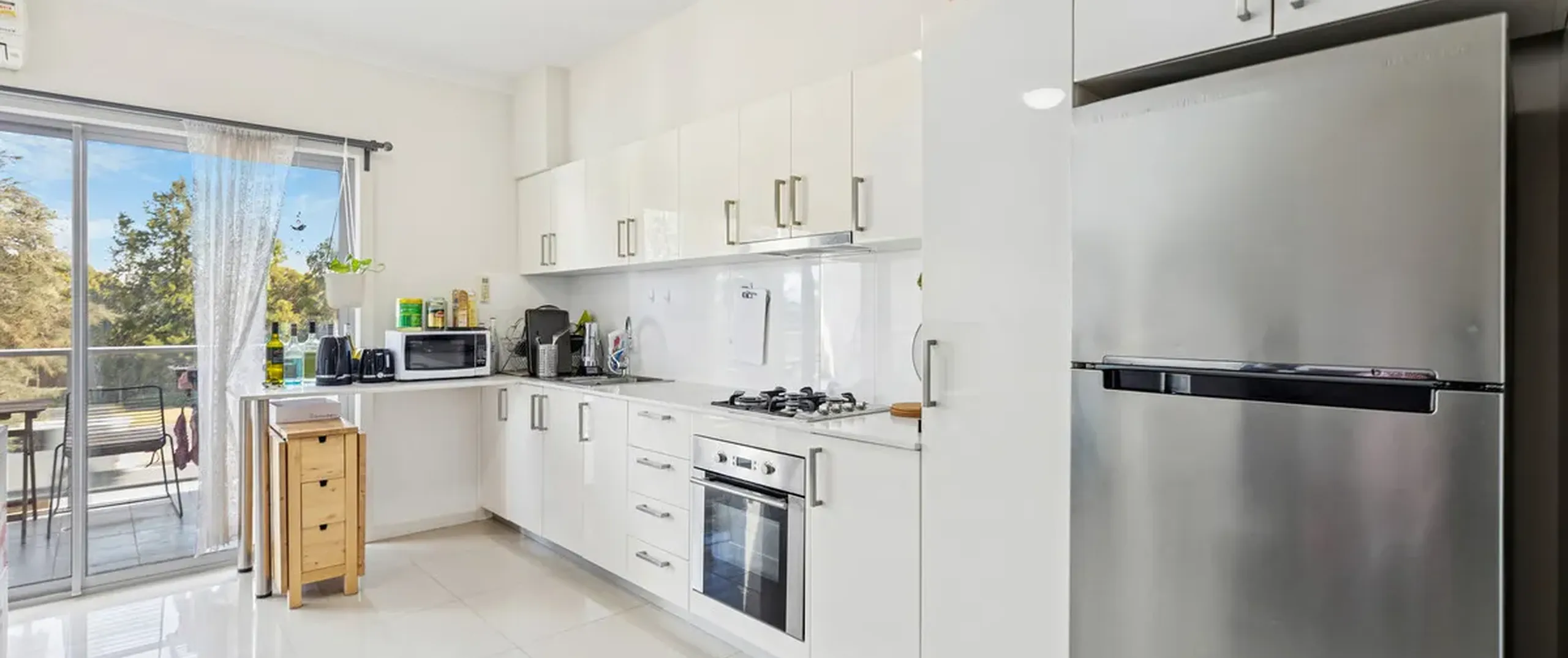 - Well-appointed kitchen offering a gas cooktop, oven, stainless steel sink and ample storage throughout