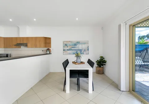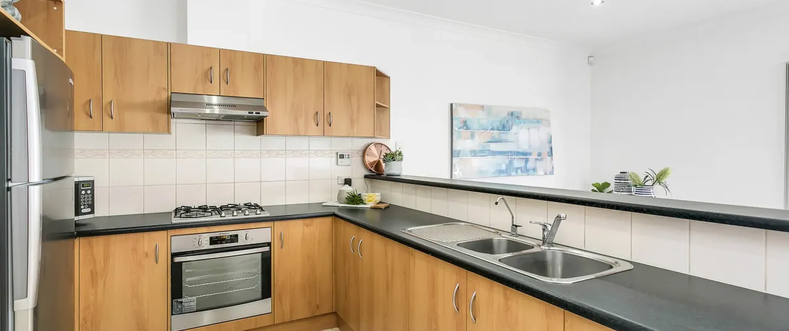 - Modern kitchen with ample bench and cupboard space, gas cooktop and breakfast bar