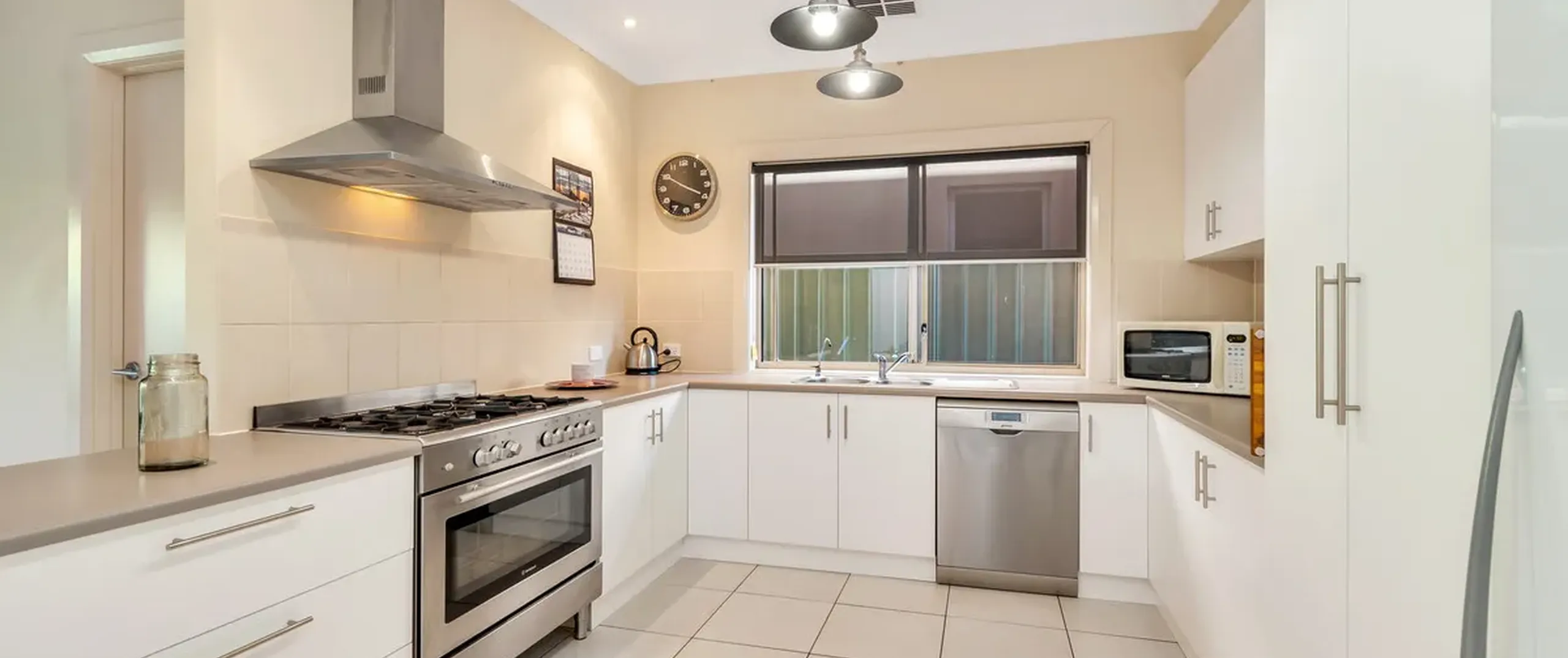 - Modern kitchen with stainless steel appliances including dishwasher and freestanding gas cooktop