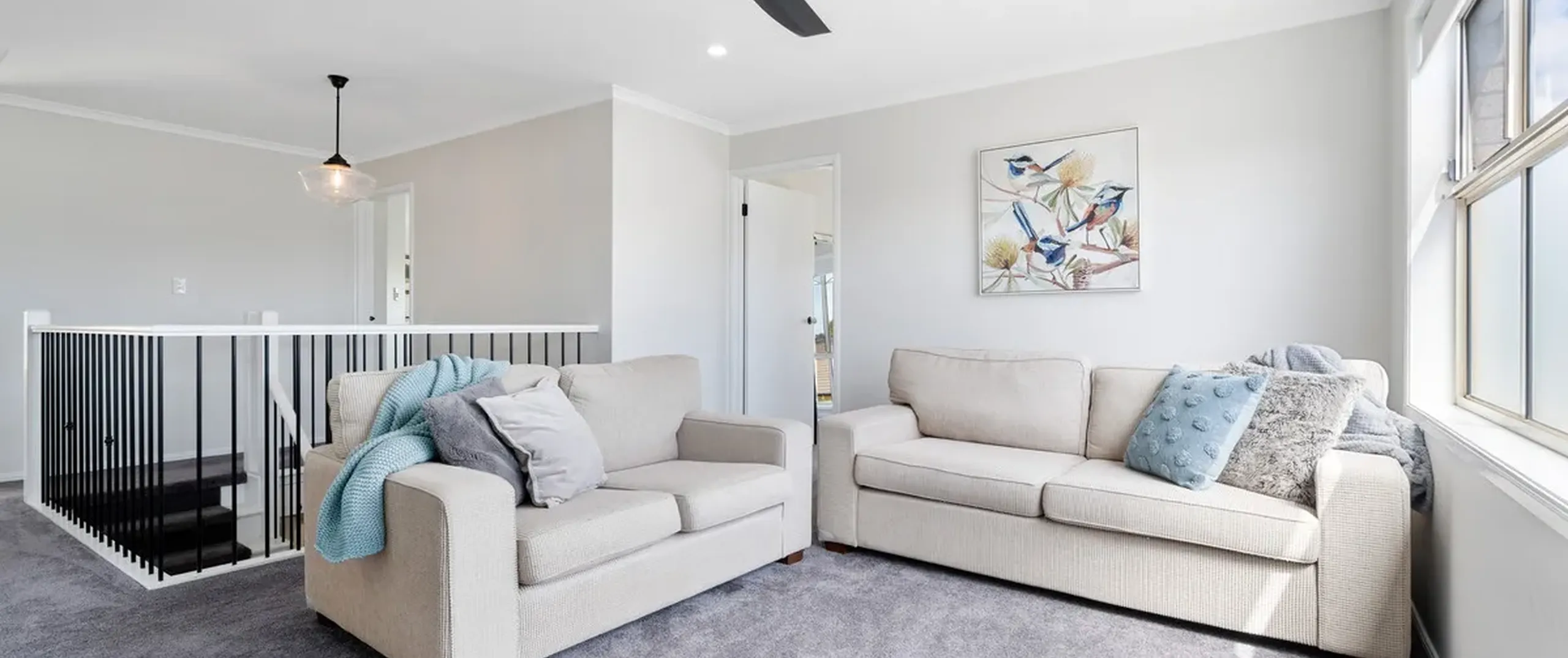 - Spacious upper living area with ceiling fan