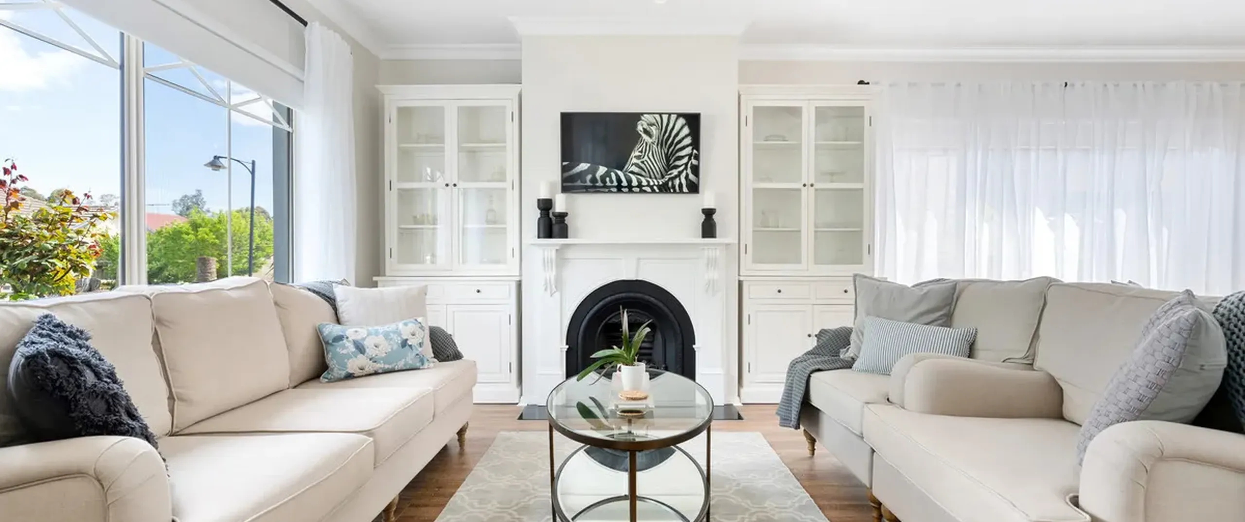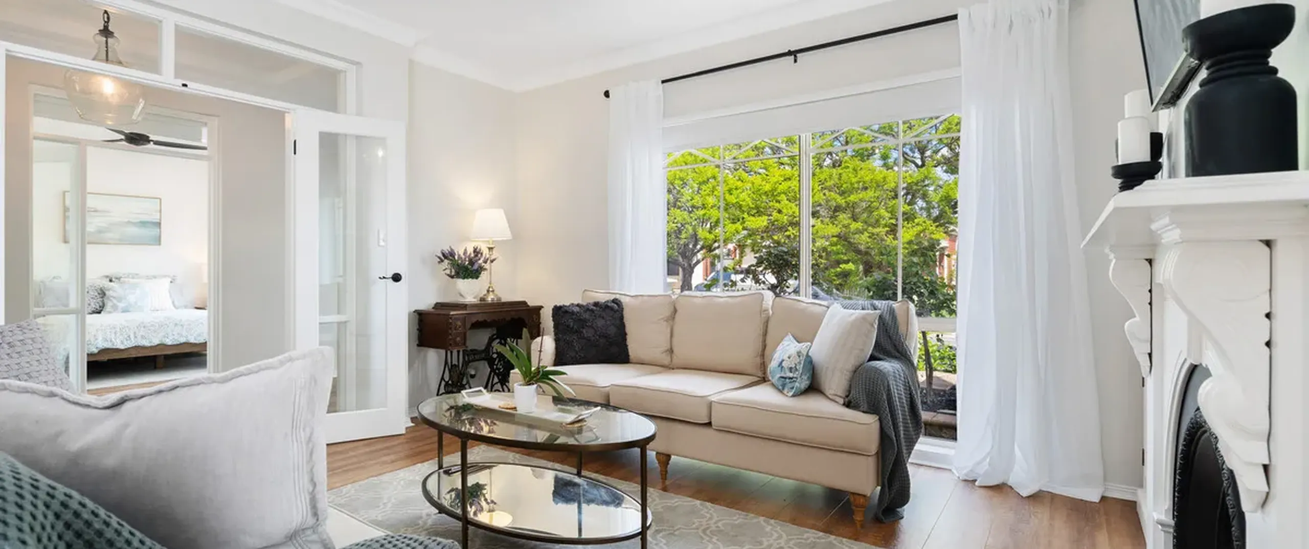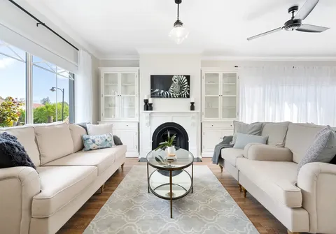 - Spacious formal lounge featuring an ornate gas fireplace and ceiling fan
