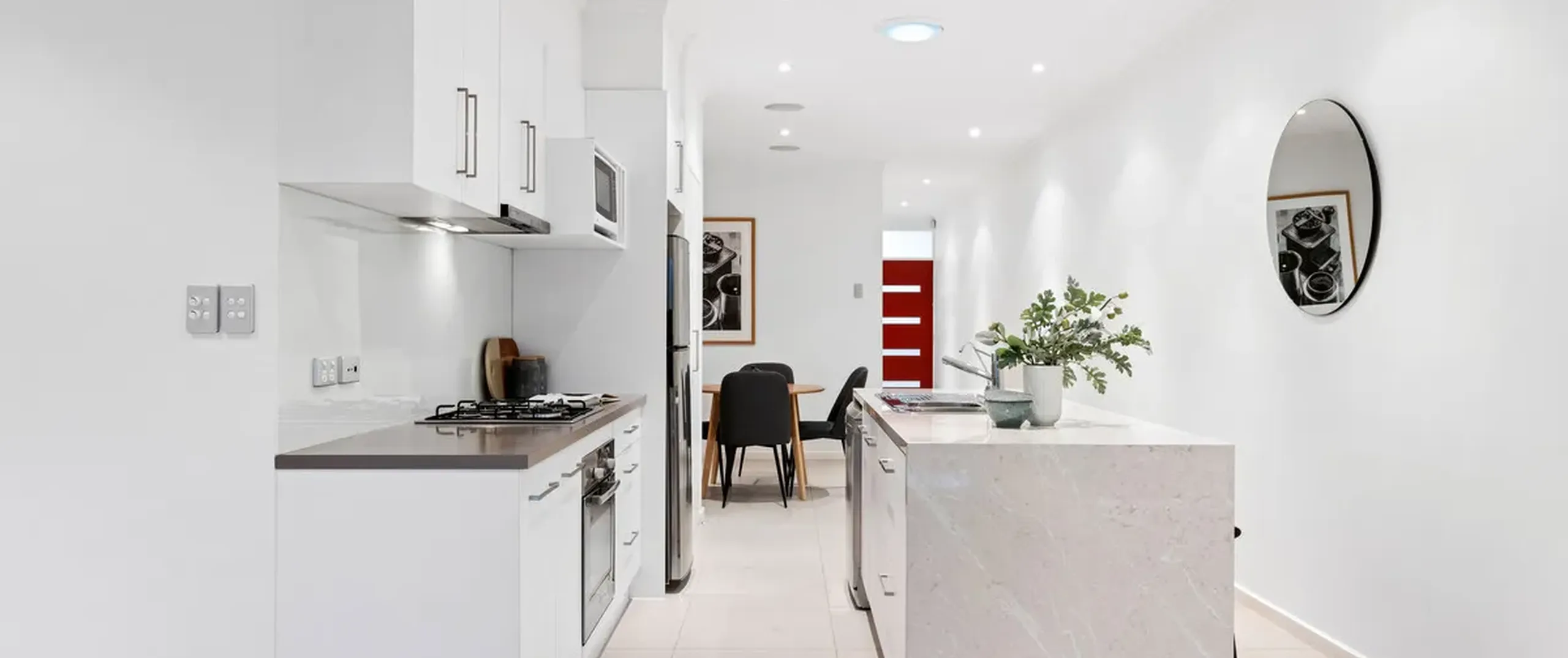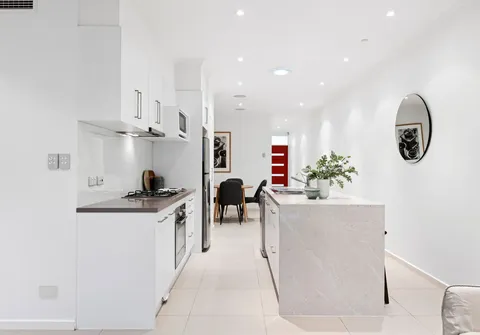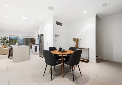 - Light-filled open-plan dining, kitchen and living area with built-in wall speakers to the living space