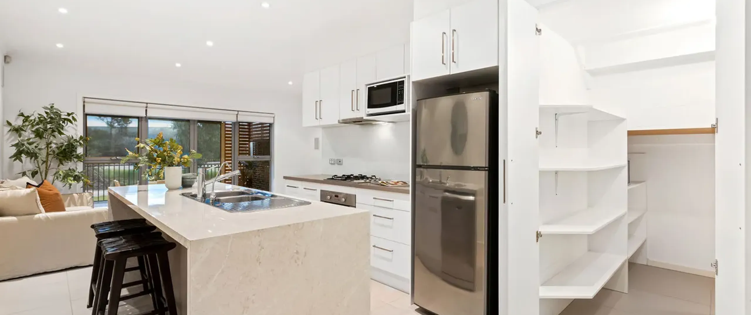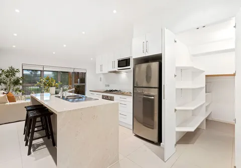 - Modern kitchen offering a suite of stainless steel appliances, walk-in pantry, island bench with waterfall benchtop and breakfast bar