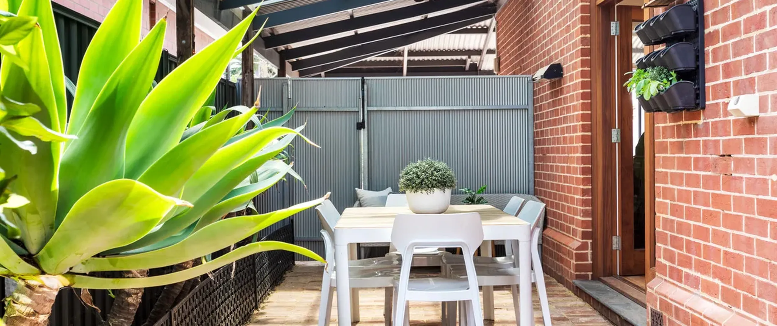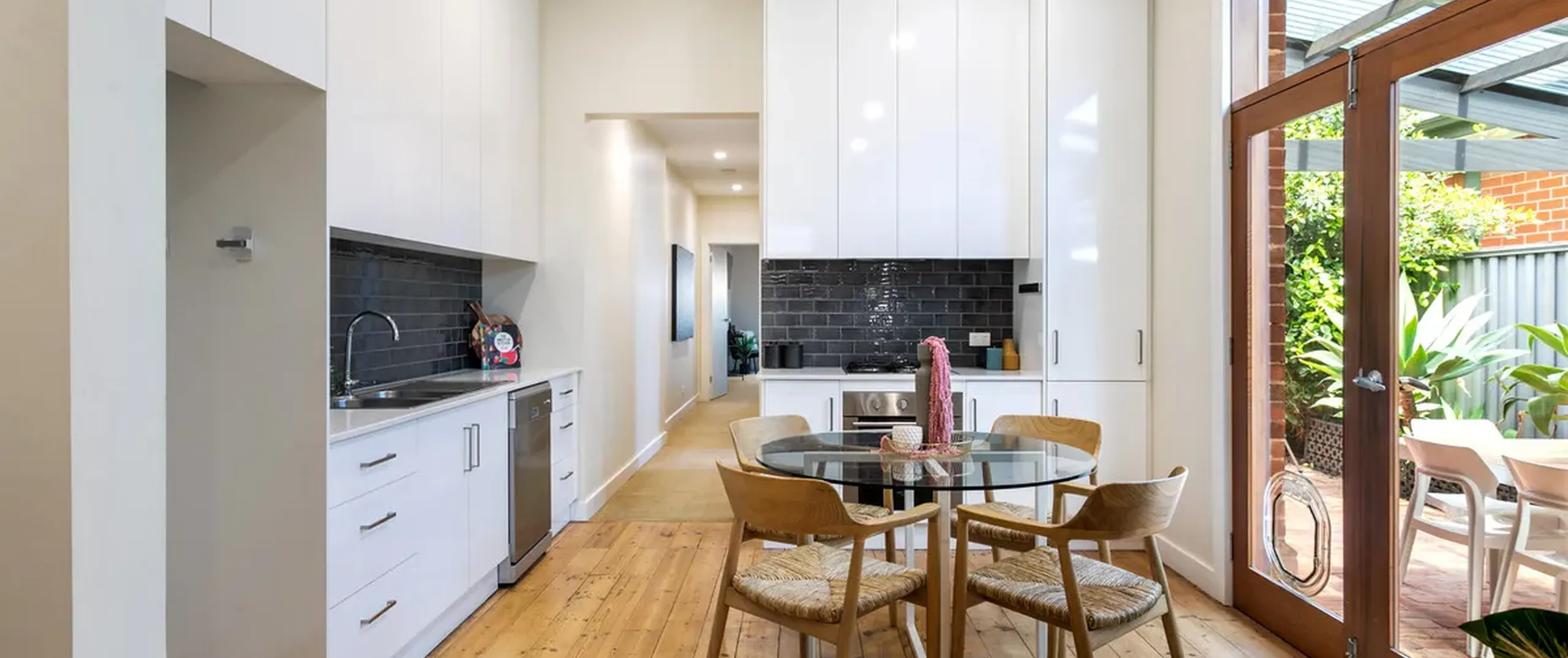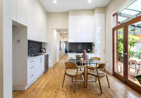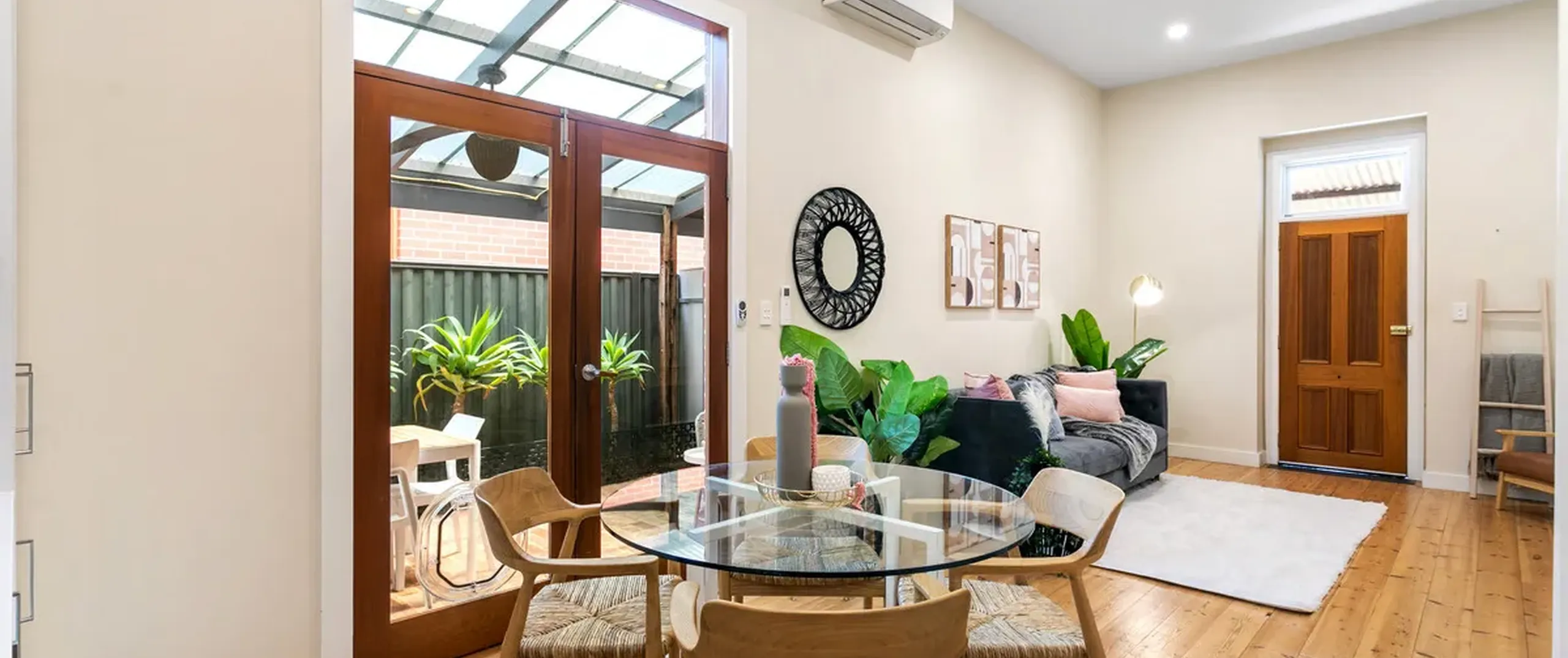 - Open plan living/kitchen/meals area featuring floorboards, high ceilings and a split system air conditioner, connecting effortlessly to the serene courtyard