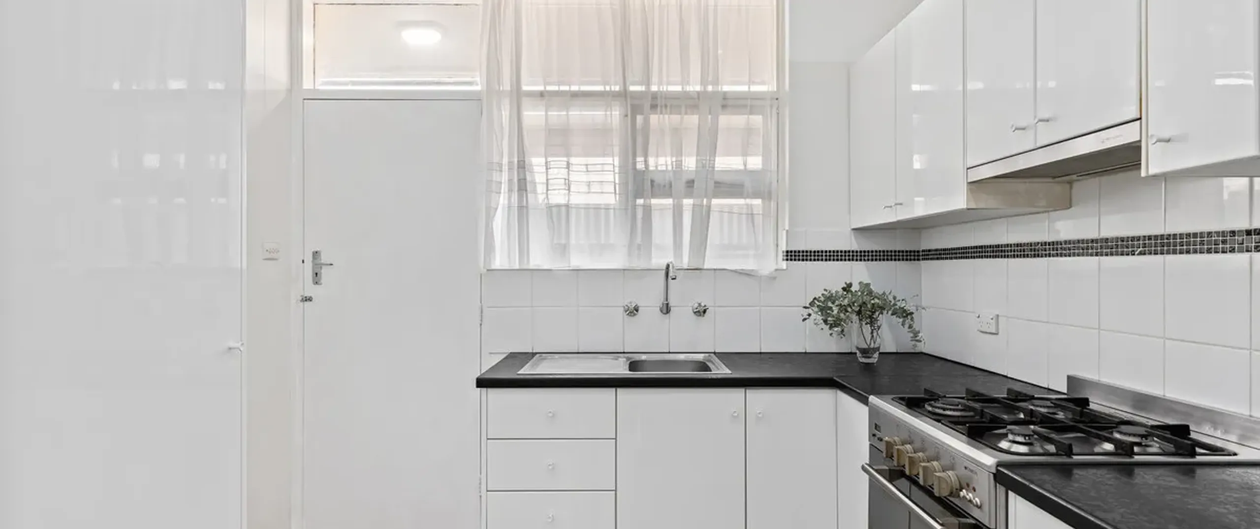 Modern flooring flows throughout the light filled living and dining and the updated kitchen is complete with gleaming cabinets and stainless steel appliances including a gas cooktop.