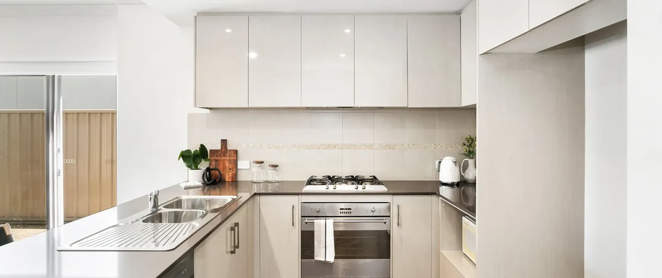 - Sleek and stylish kitchen with stainless steel appliances including dishwasher, gas cooktop and tiled splash back
