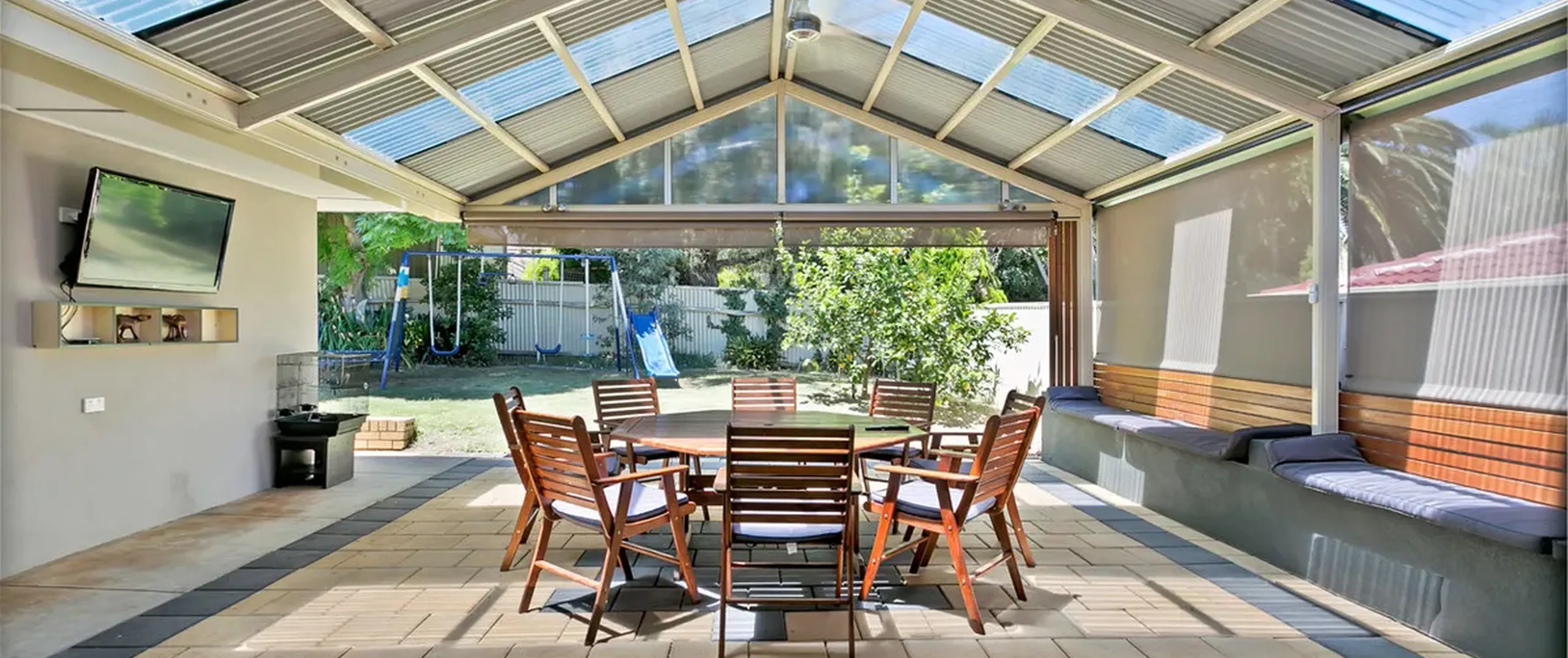 - Expansive undercover outdoor entertaining area with ceiling fan and café blinds