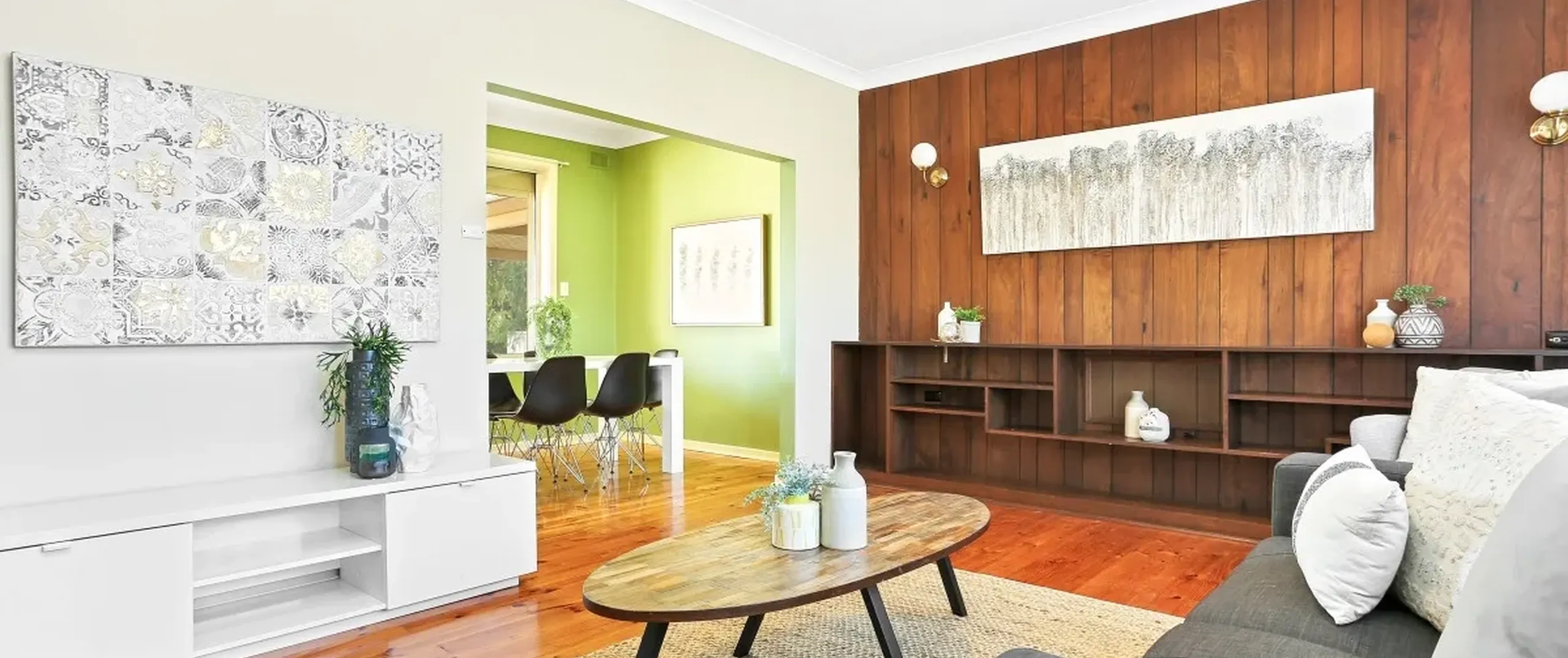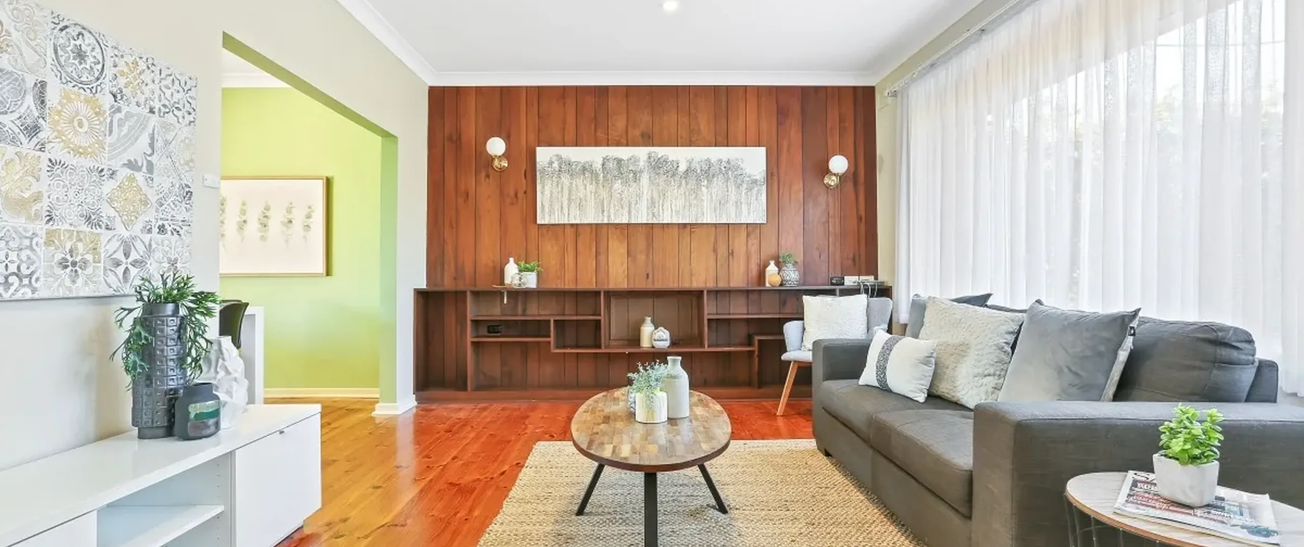 - Large lounge with beautiful polished floorboards and built-in shelving