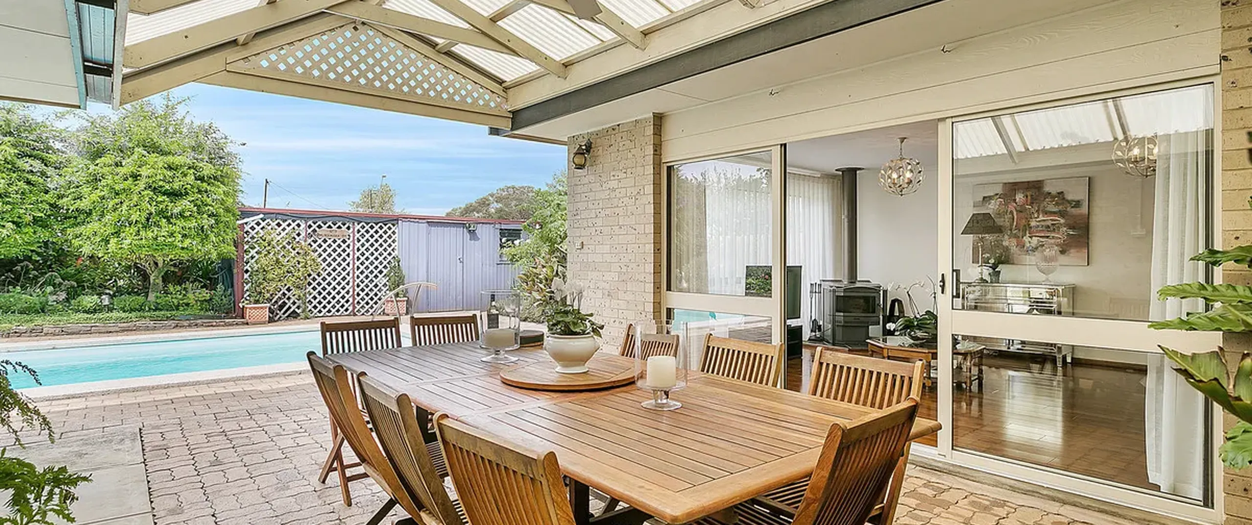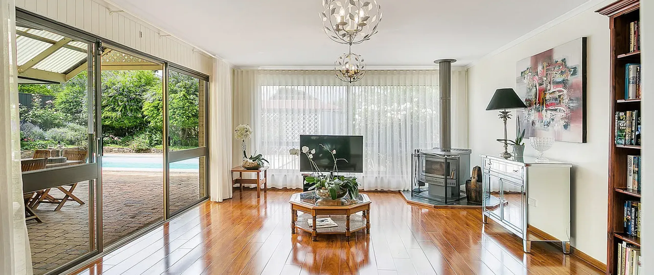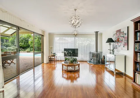 - Second large family room with stunning laminate flooring, big picture windows with pool views, new natural sheer curtains and wood combustion heater, offering a feeling of 'old world charm'