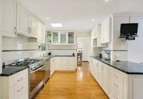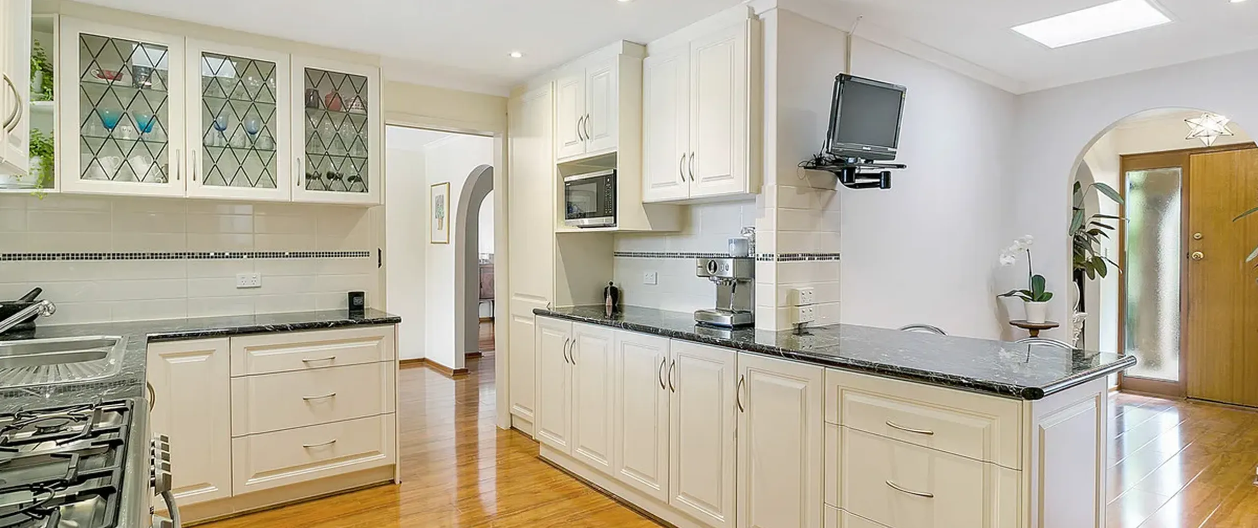- Fully renovated, stylish kitchen with soft-close drawers, stainless steel appliances including double door dishwasher, 5 burner gas cooktop and 90cm wide oven for the aspiring chef, ample bench and cupboard space, island bench, breakfast bar, large double French door fridge included with sale plus another wall-mounted swivel TV for kitchen viewing also included