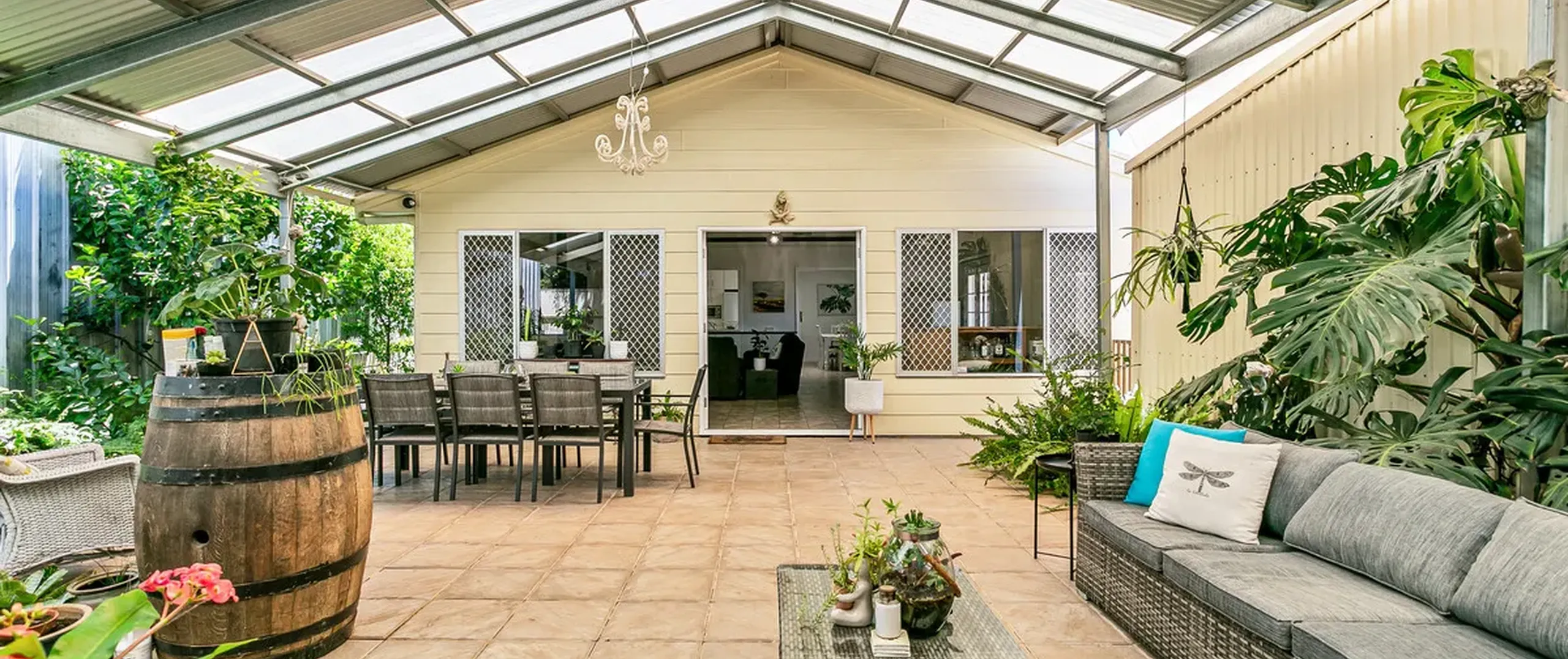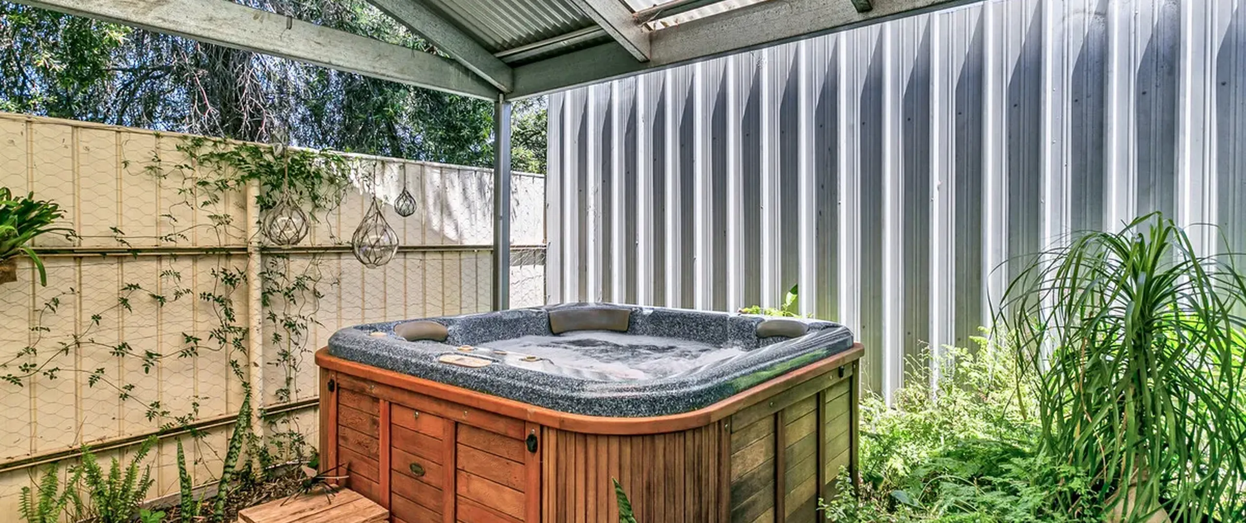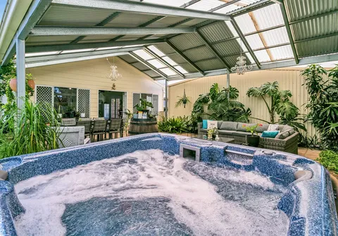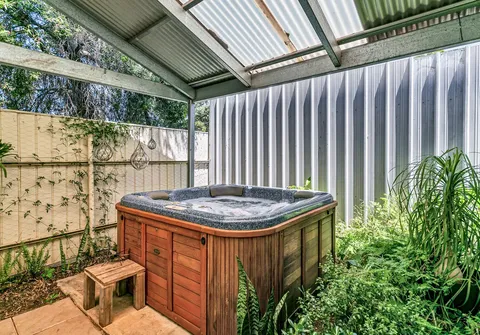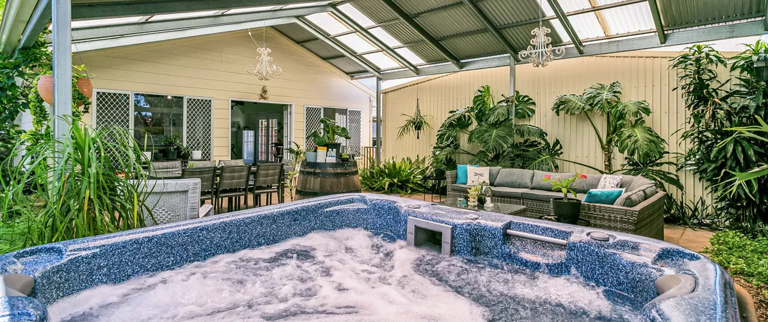 - An exceptional undercover entertainment area with pitched pergola and including a spa