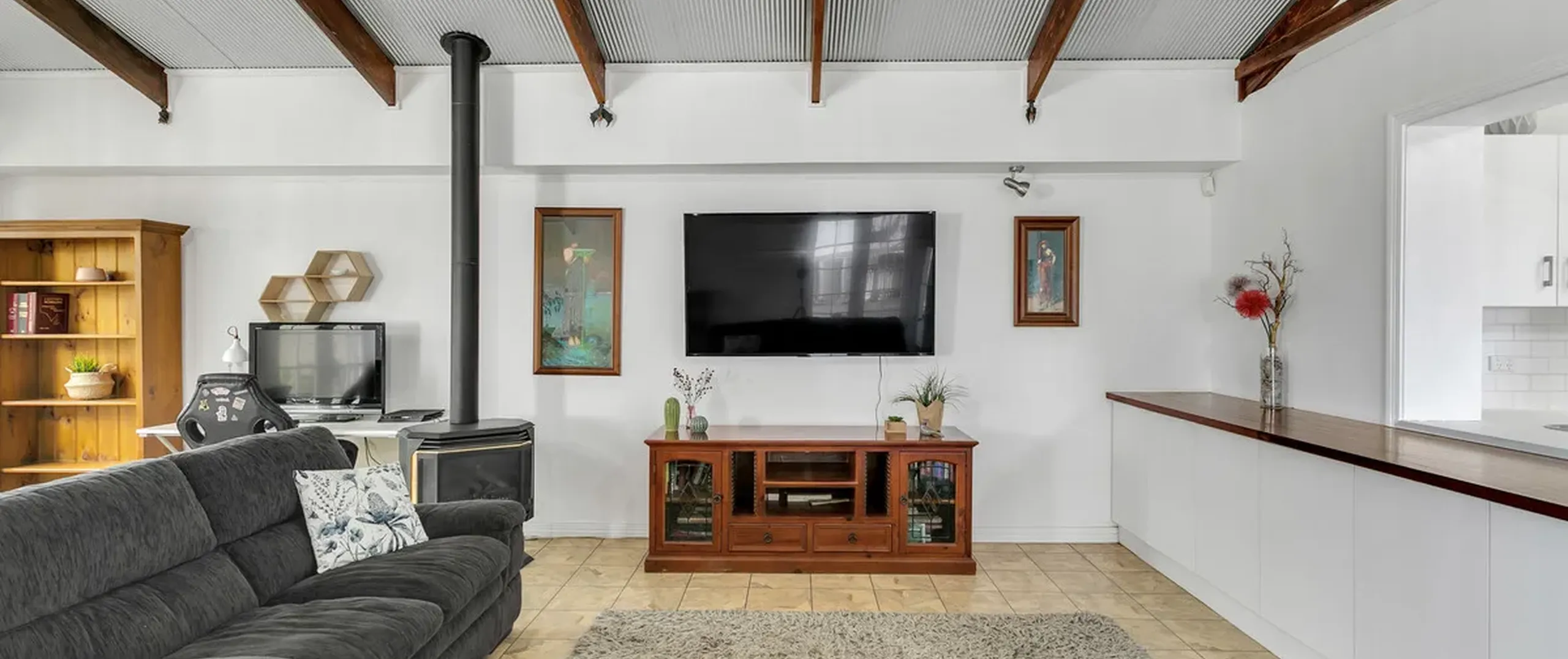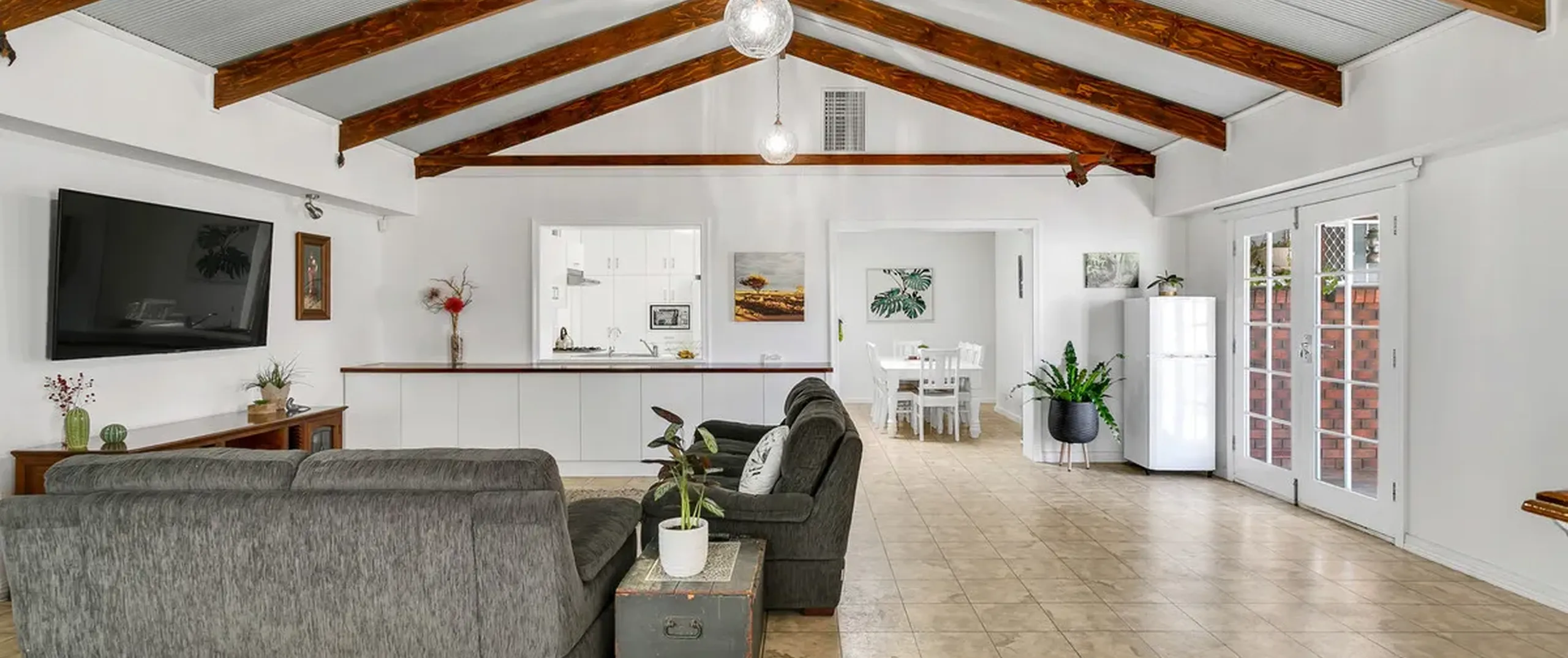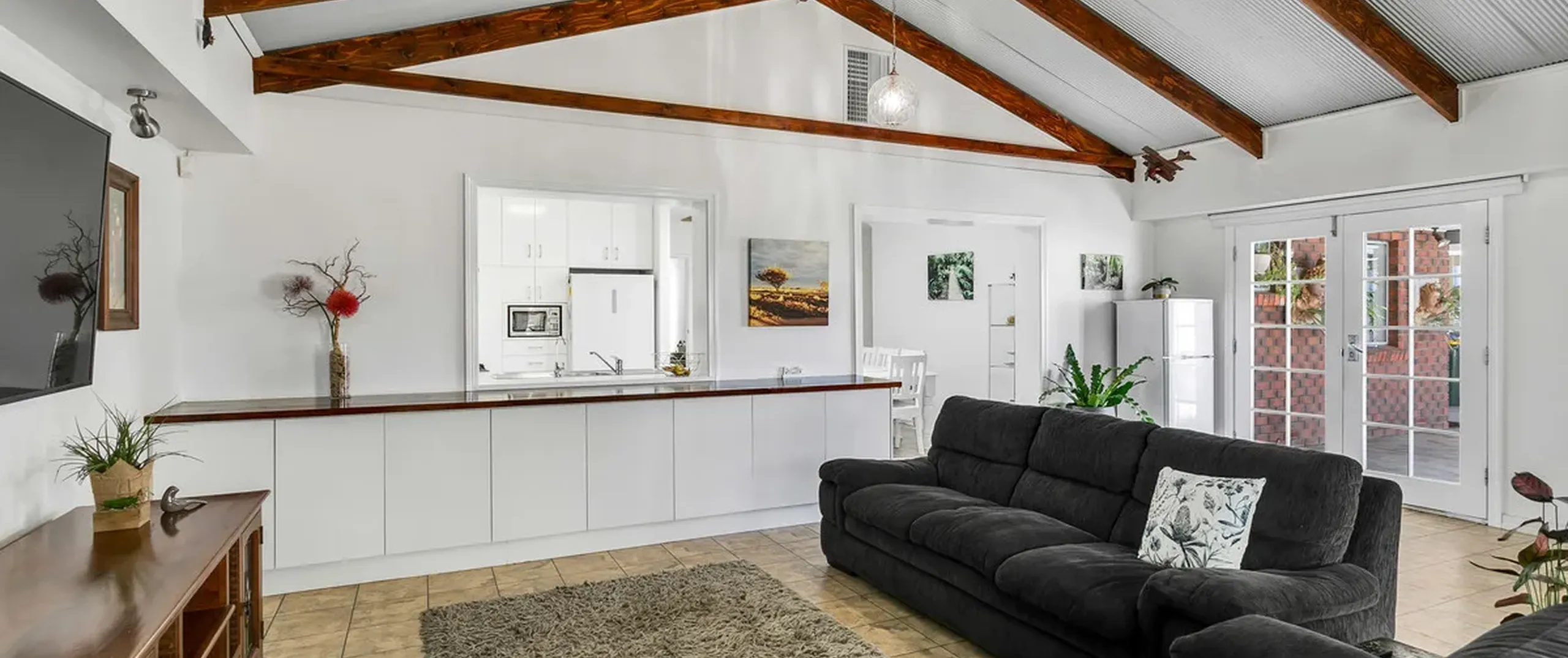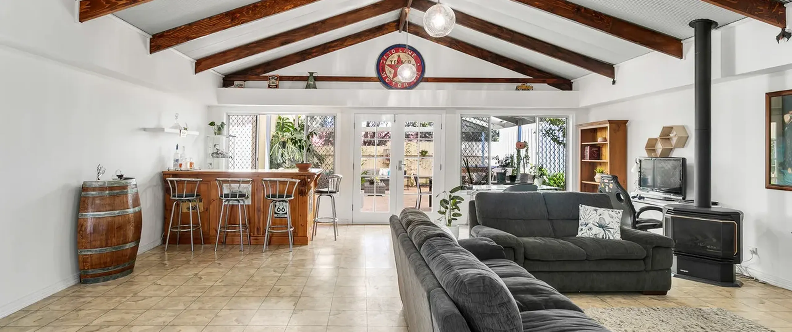 - Giant rumpus room showcasing mini orb iron ceiling and rafters, custom made island bench complete with cupboards and a stunning jarrah bench top and French doors (The bar is excluded)