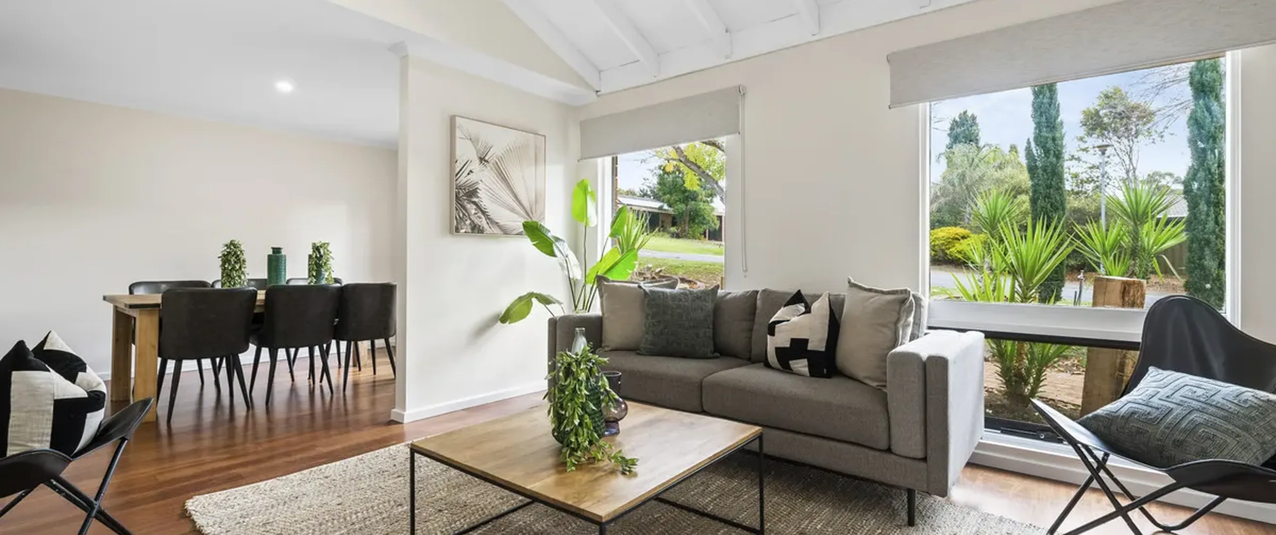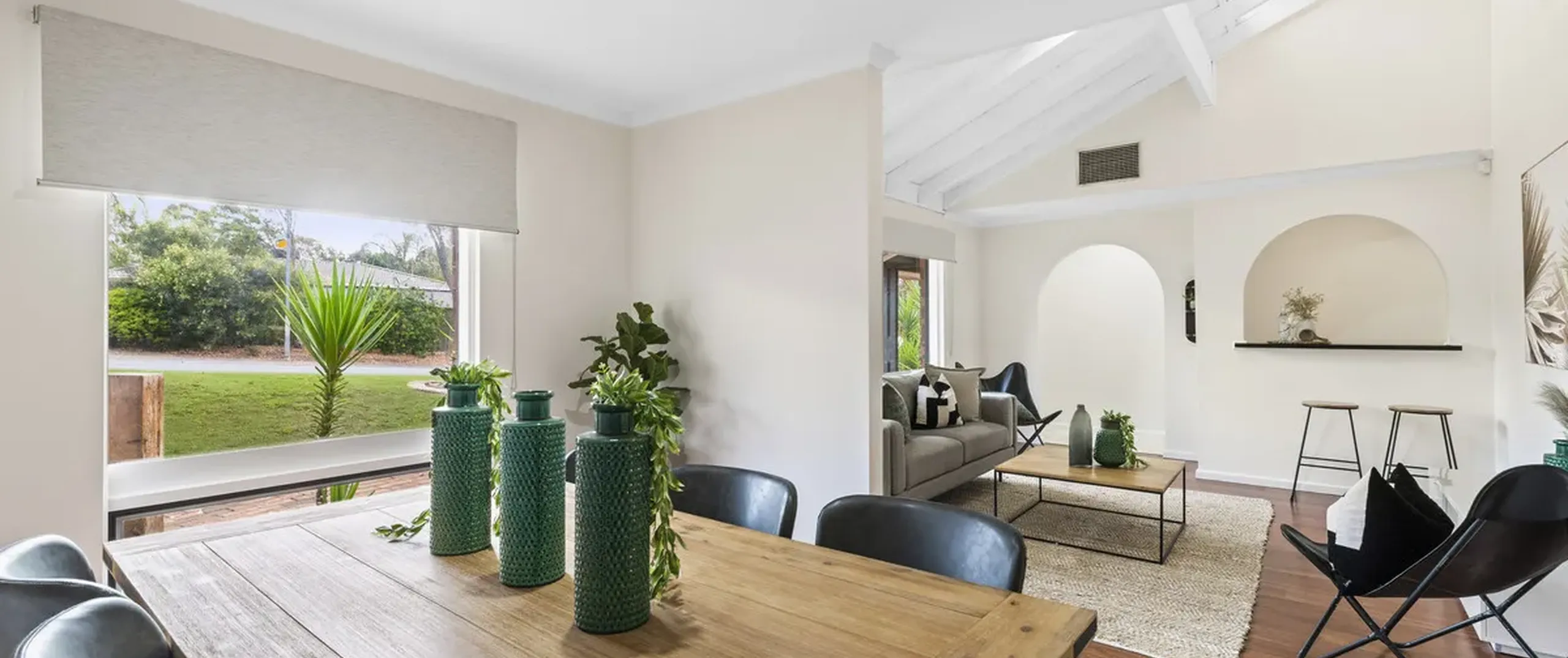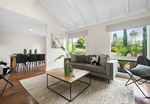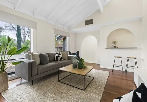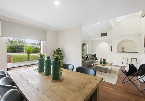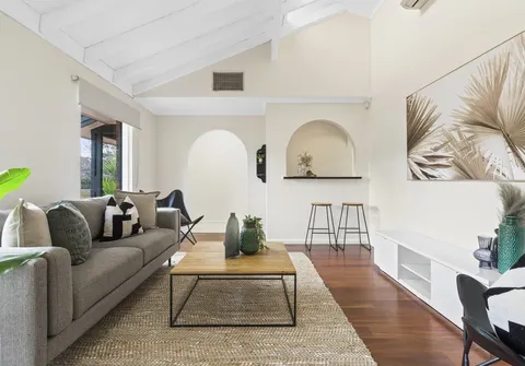 Set just off the entry is the large lounge room with a soaring pitched ceiling, a built-in bar and direct access through to the dining room.