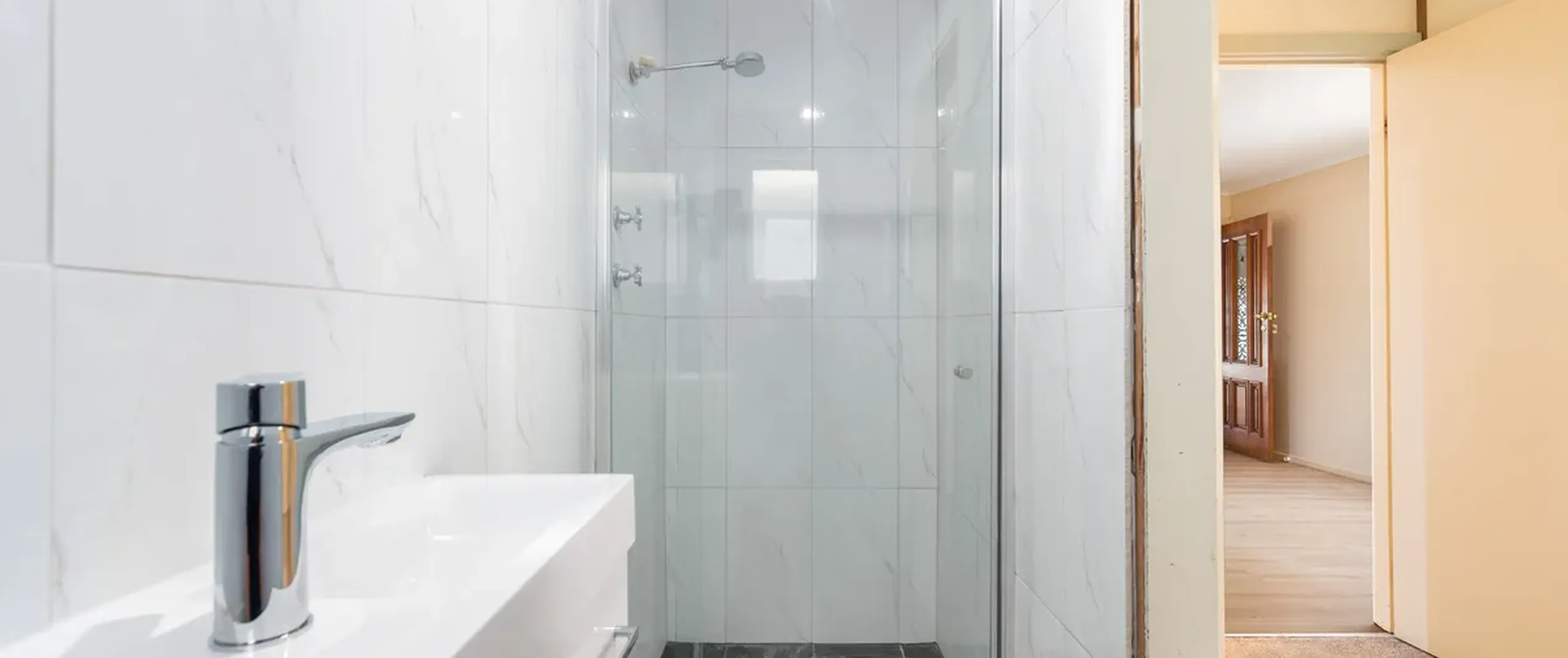 - Light, bright and on-trend renovated bathroom with floor-to-ceiling tiles, bathtub and shower
