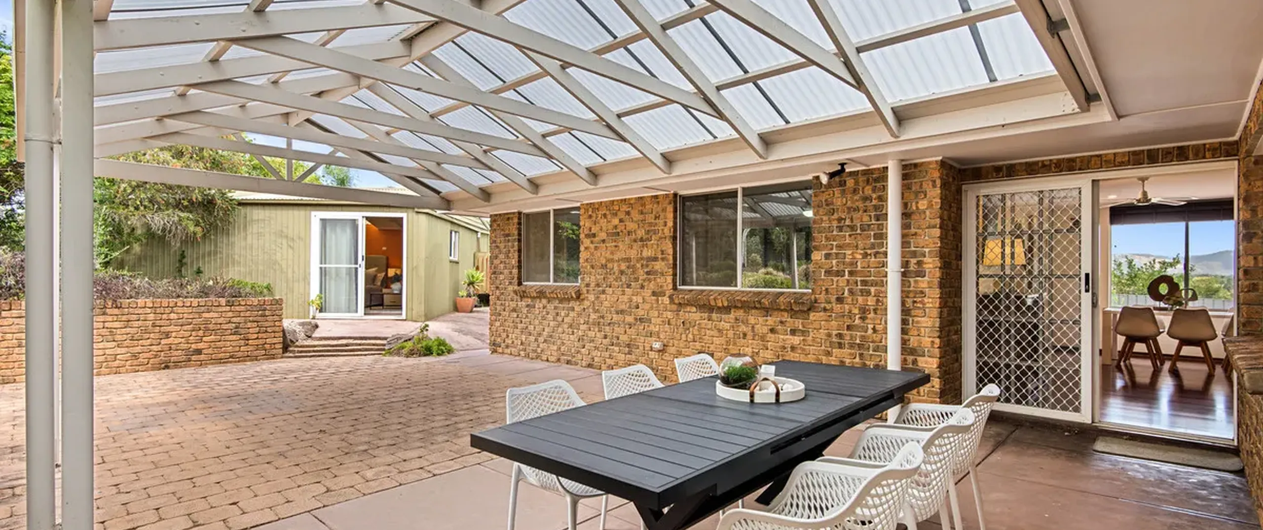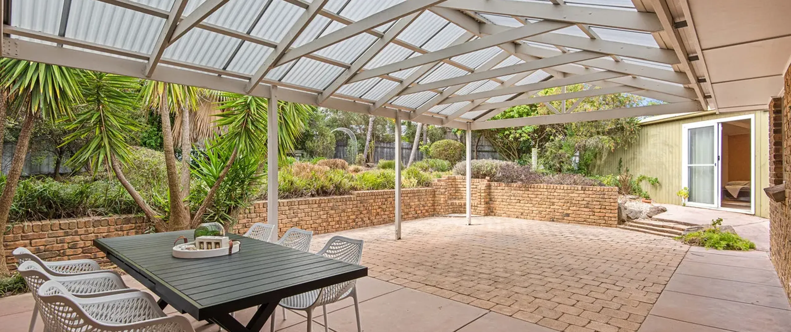 - Expansive pergola with pitched roof; perfect for outdoor entertaining
