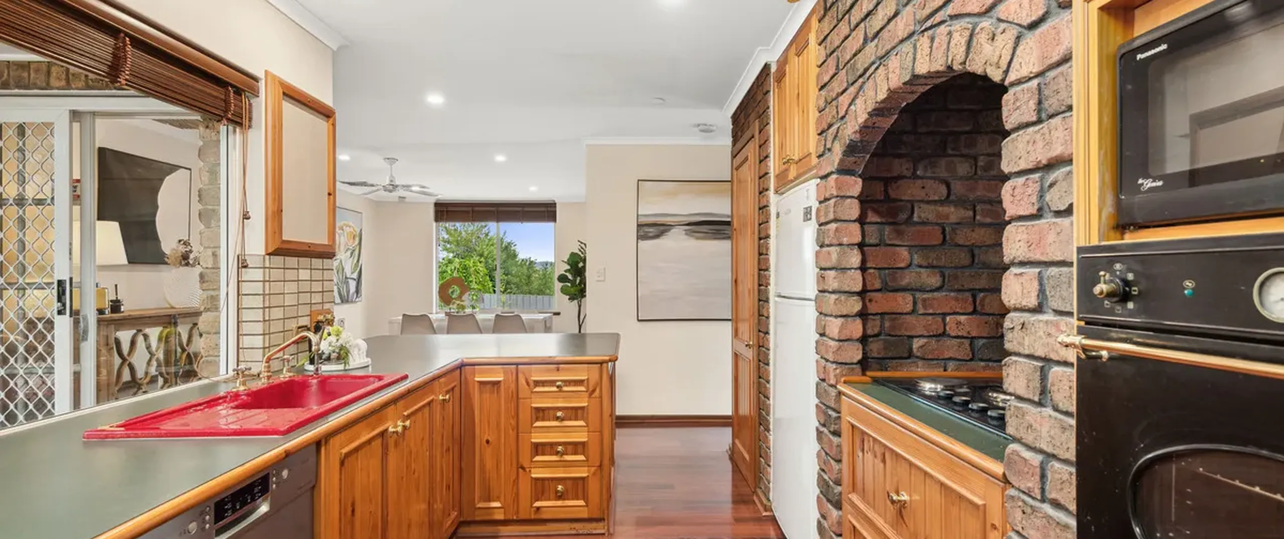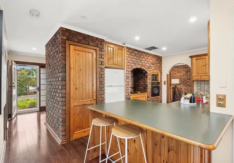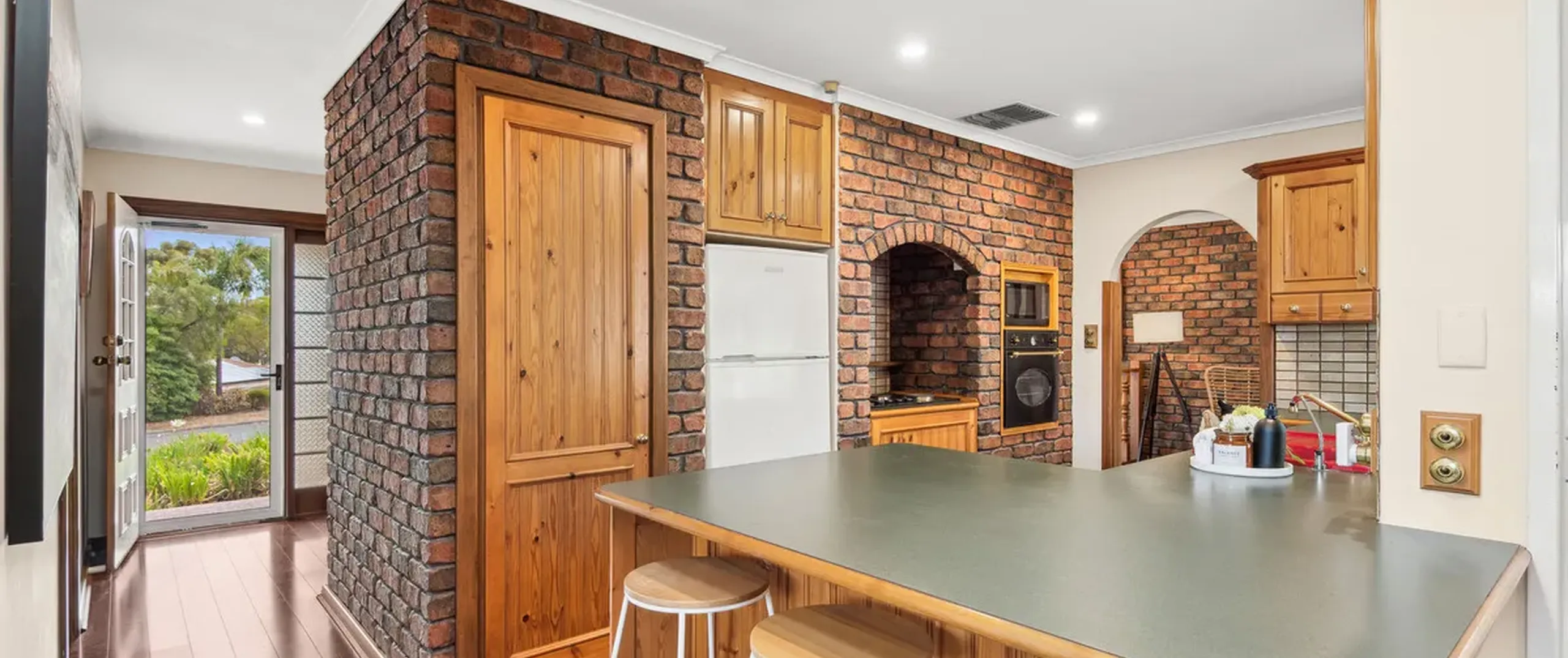 - Charming country-style kitchen featuring a stainless-steel dishwasher, breakfast bar, timber cabinetry and exposed brickwork