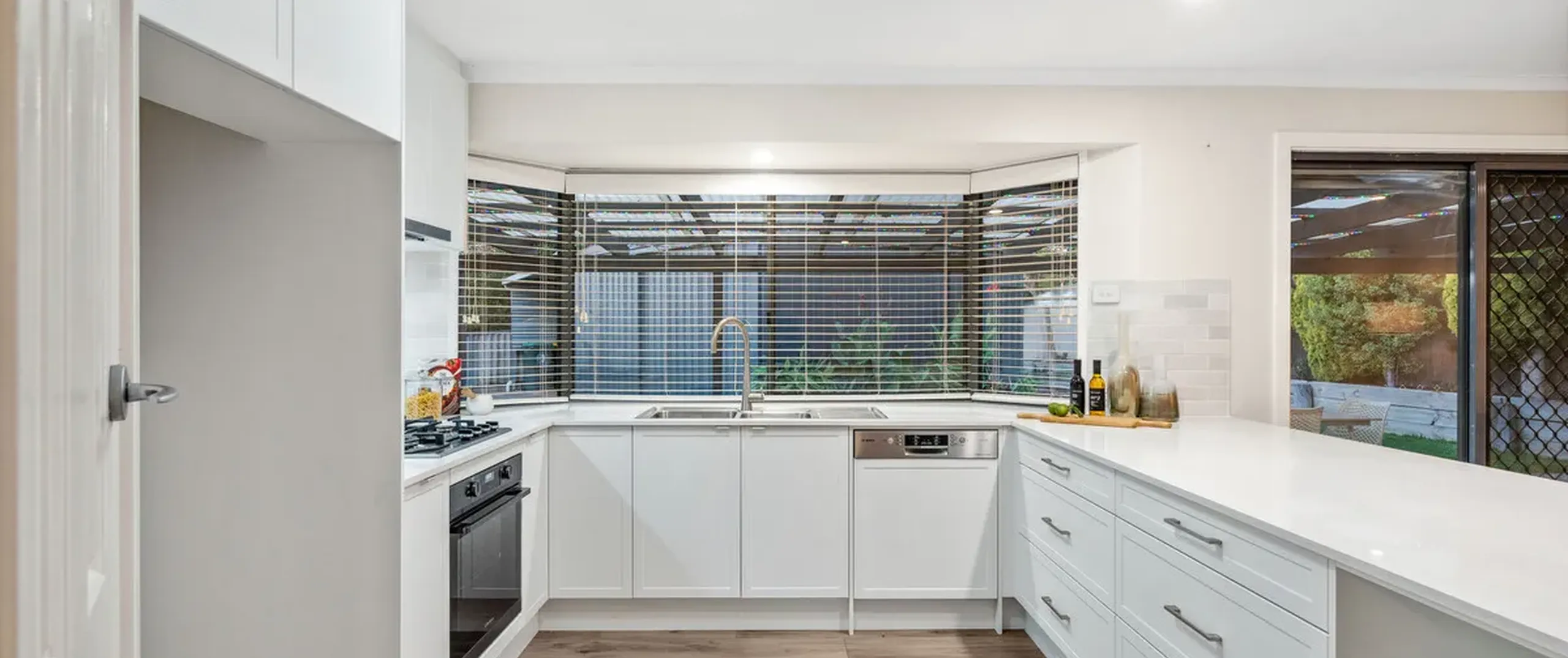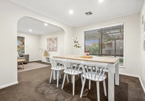 Natural light floods the generous, open-plan living and dining areas, accentuated by on-trend floating floors throughout. A separate formal living and dining room at the front of the home, complete with plush carpets, provides additional space to cater to the needs of a growing family. The sleek white chef’s kitchen overlooks the living area and boasts quality appliances, including a gas cooktop, oven, dishwasher, sweeping benchtops, and a convenient breakfast bar.