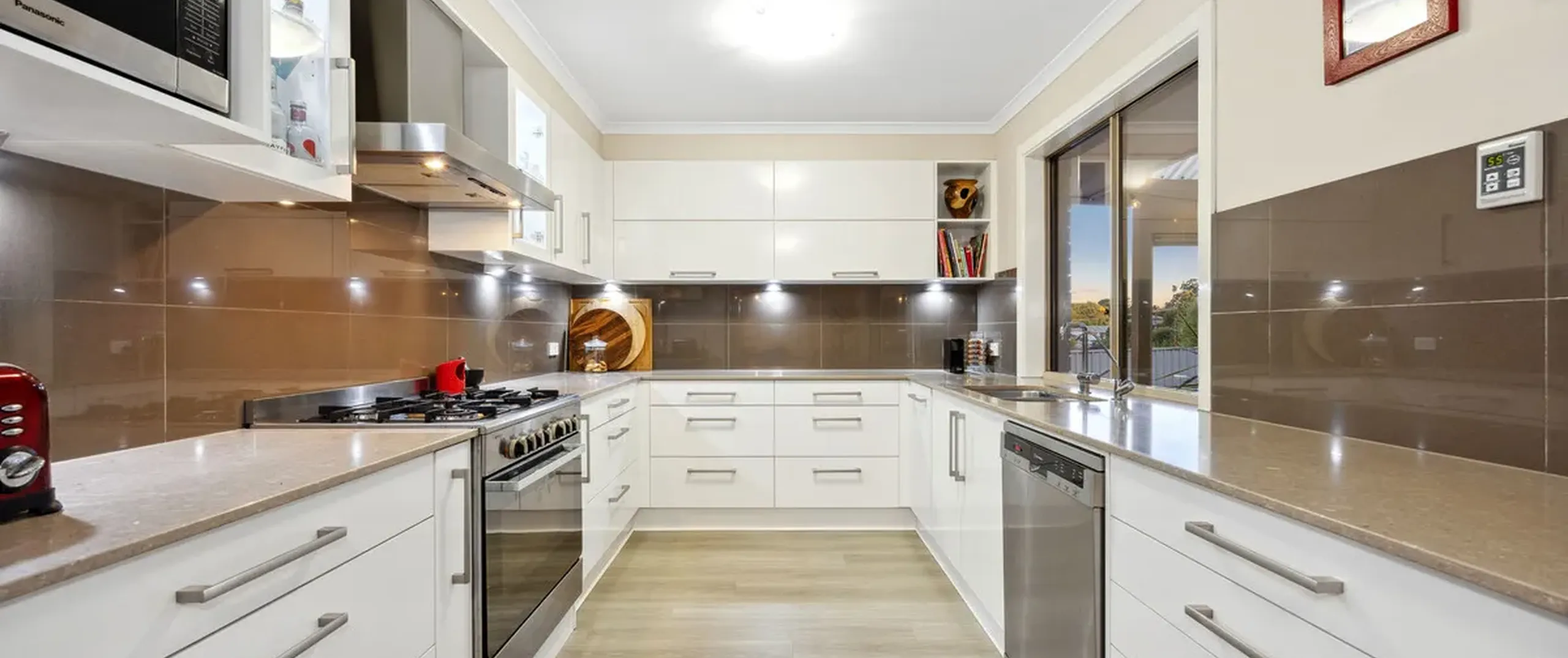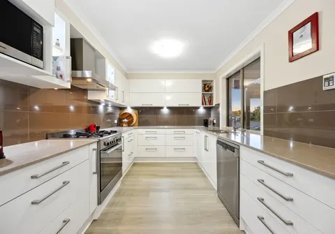 - Modern and stylish kitchen with stone benchtops, stainless steel appliances including gas cooktop and Westinghouse dishwasher, walk-in pantry and ample bench and cupboard space