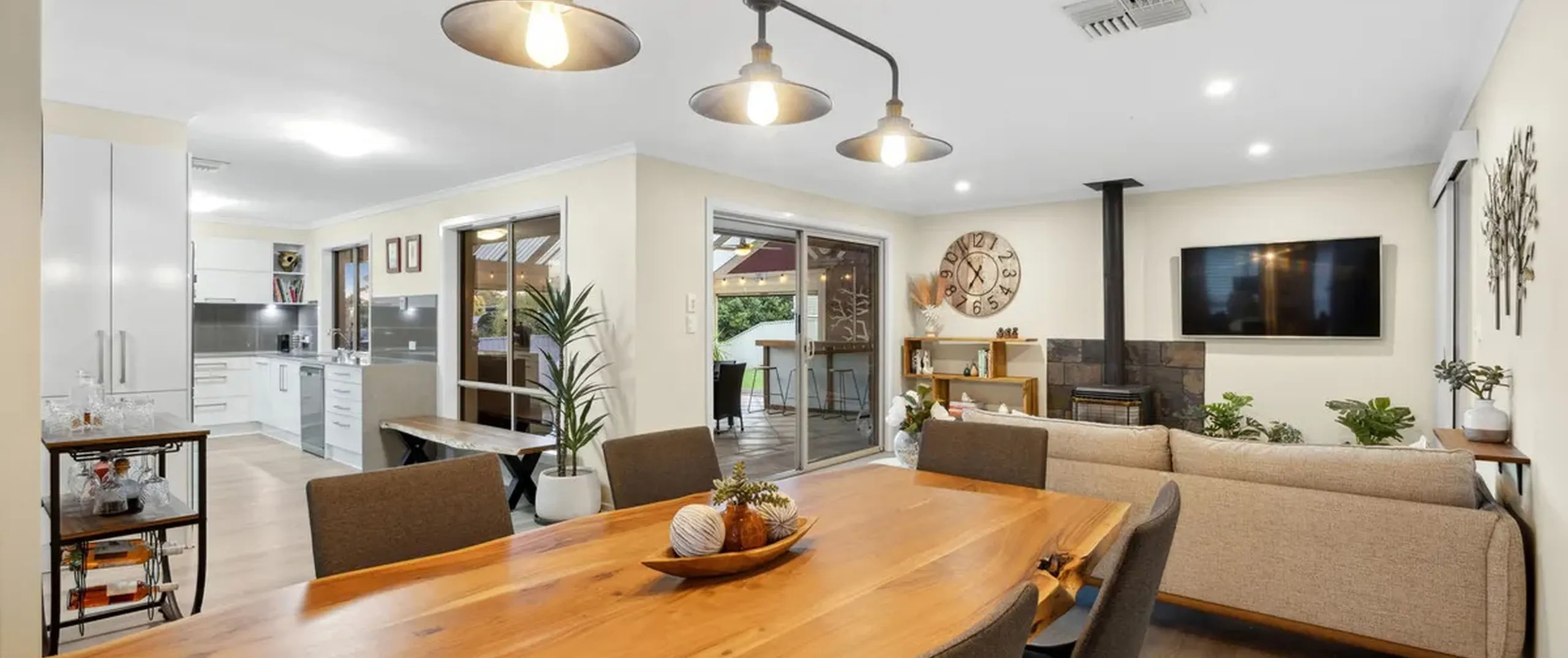 - Open plan living, dining and kitchen area with heater, making the perfect space to entertain