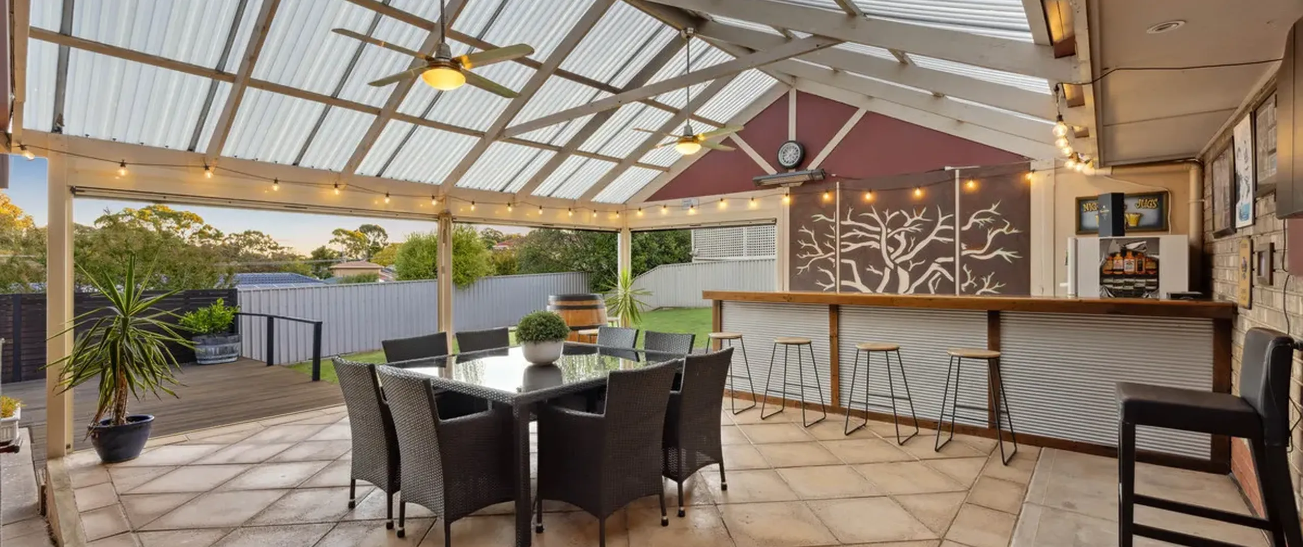 - Outdoor entertaining area with pitched roof, two ceiling fans, blinds and built-in bar