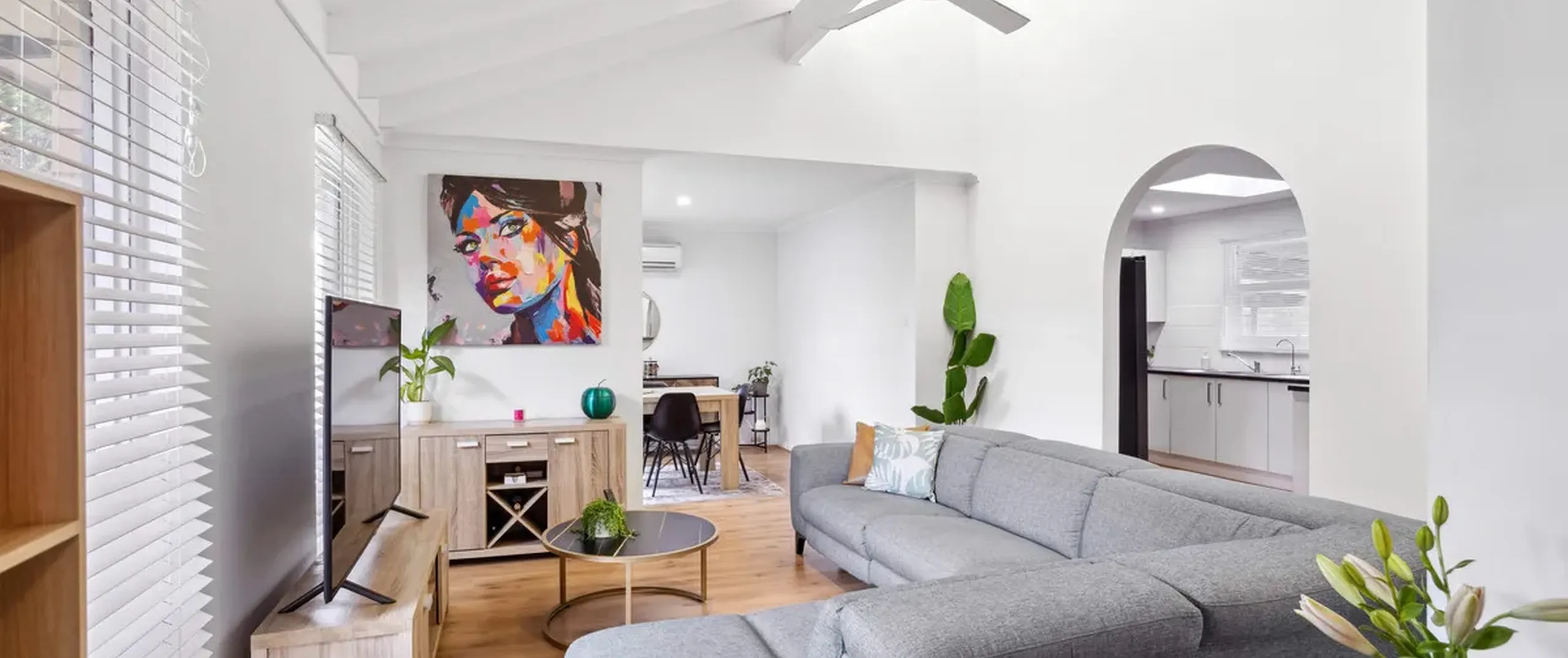 - Open-plan living and dining space with ceiling fan, split system air conditioner and bar