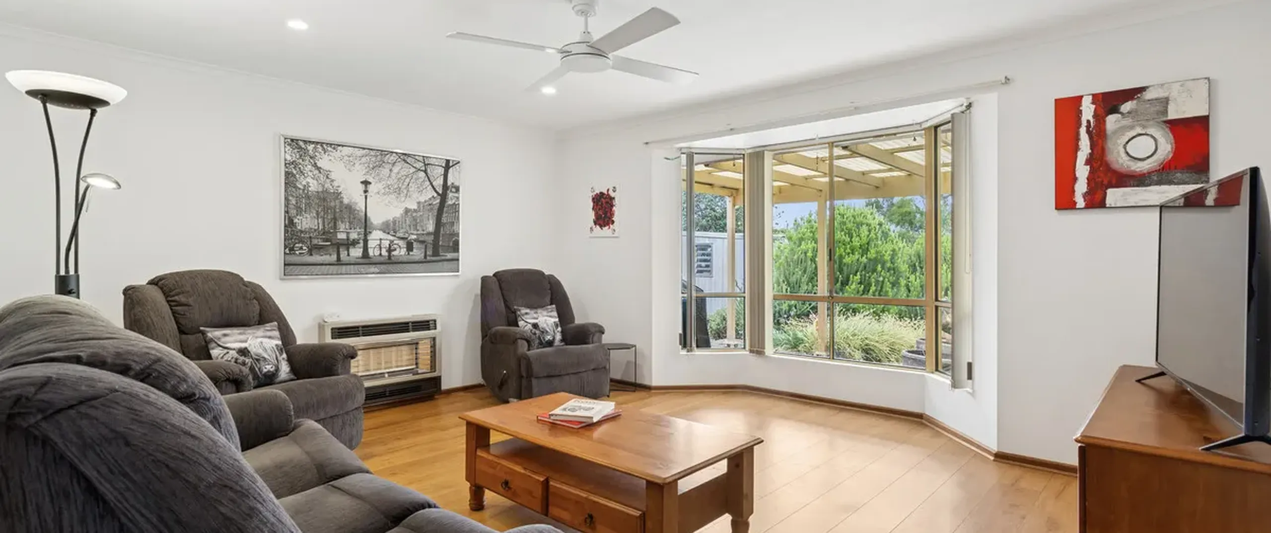 - Spacious formal living room with a bay window and gas heater