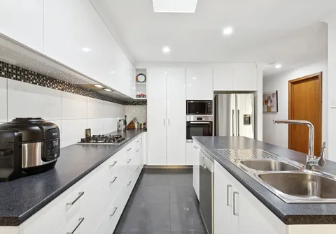 The well-appointed, centrally located kitchen is a highlight, complete with a Bosch oven, gas cooktop, dishwasher, double stainless steel sink, ample storage, and a kitchen island with breakfast bar, all bathed in natural light from a skylight. Flowing seamlessly from the kitchen is the dining area, with direct access to the expansive undercover outdoor entertainment area, ideal for gatherings. A family area and spacious formal living room with a beautiful bay window provide additional space for relaxing and entertaining.