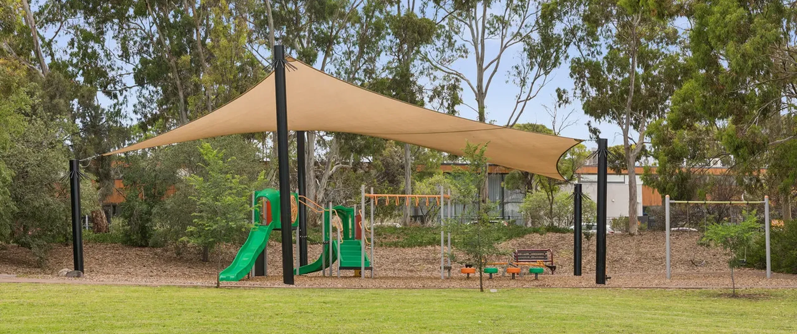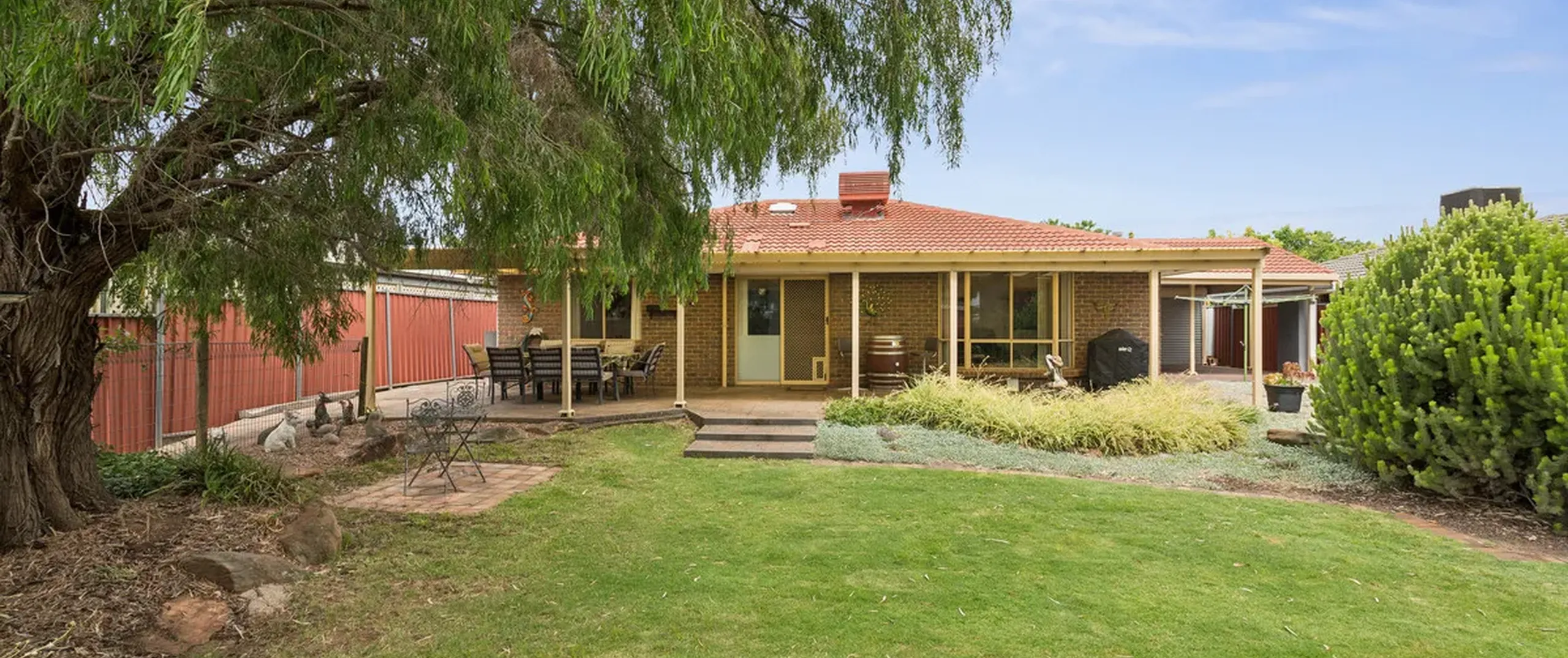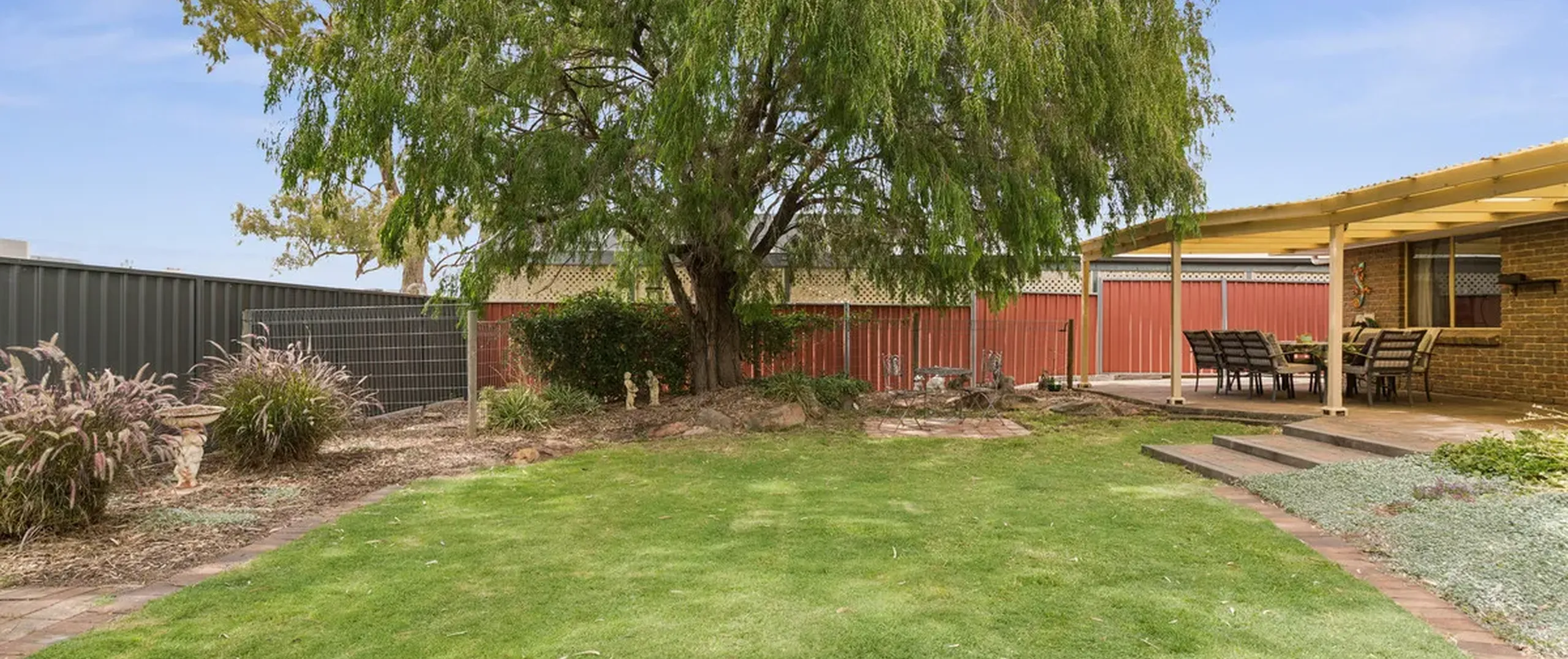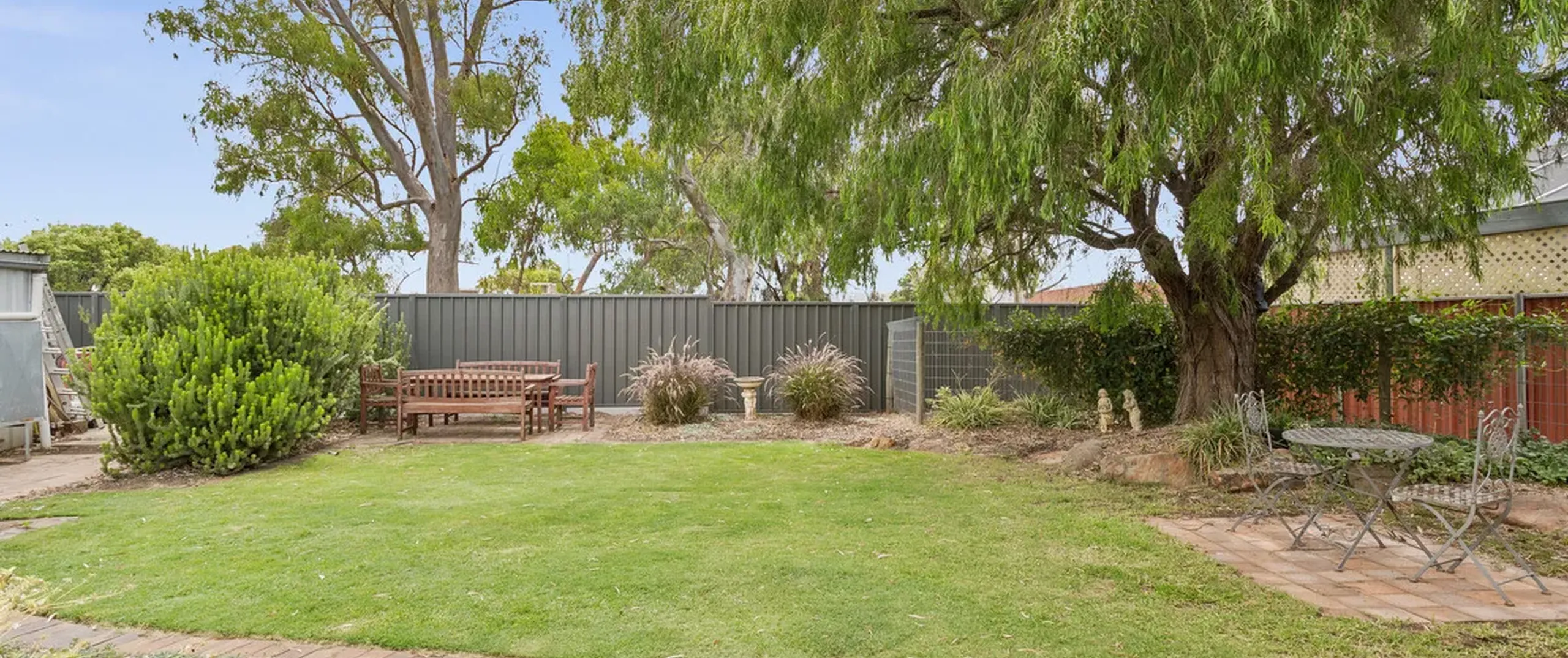 - Large rear yard with grassed area, low maintenance established gardens, and trees