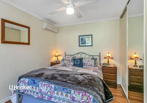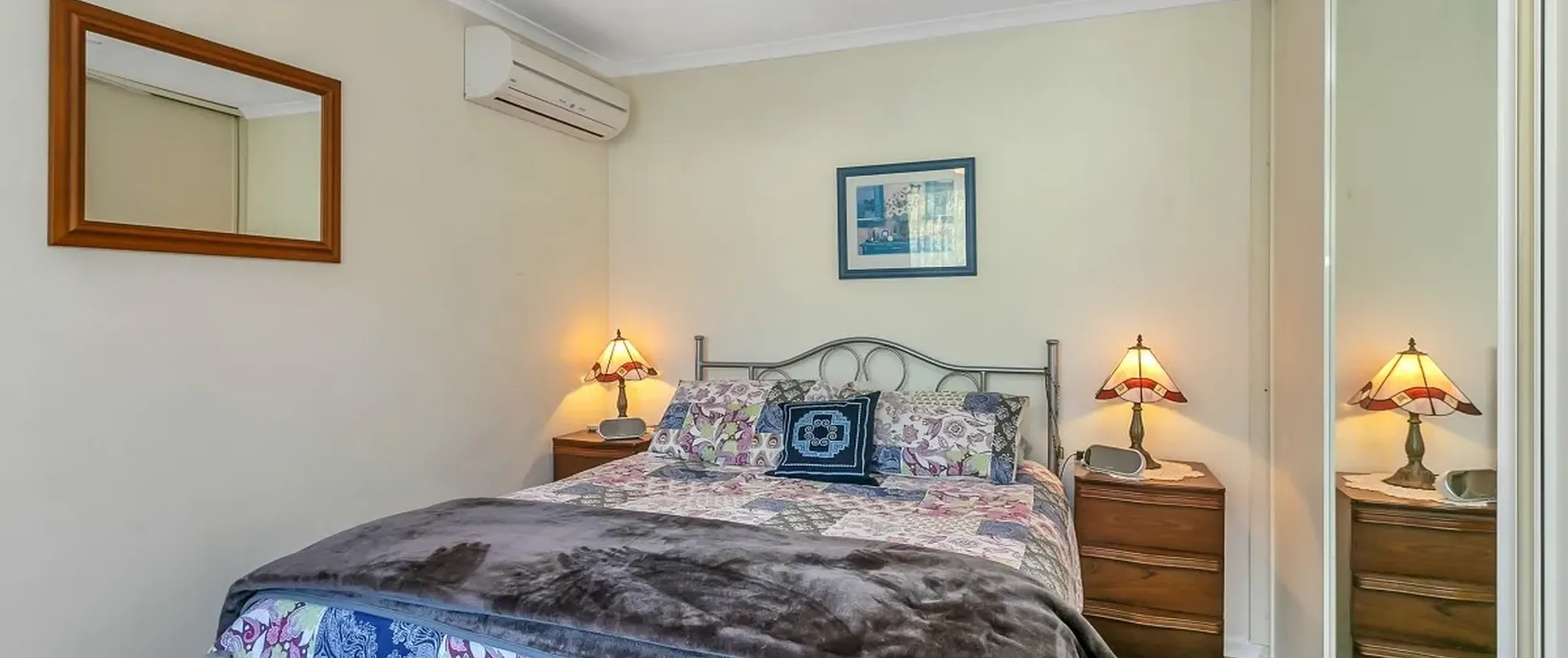 - Master bedroom with built-in robe, ceiling fan and split system air conditioner