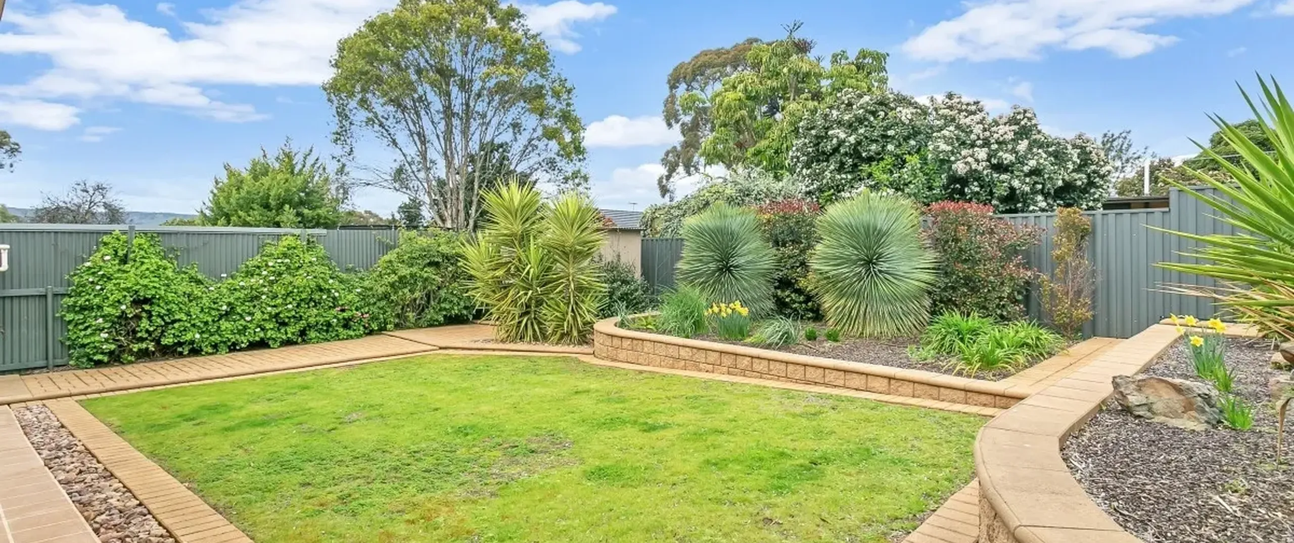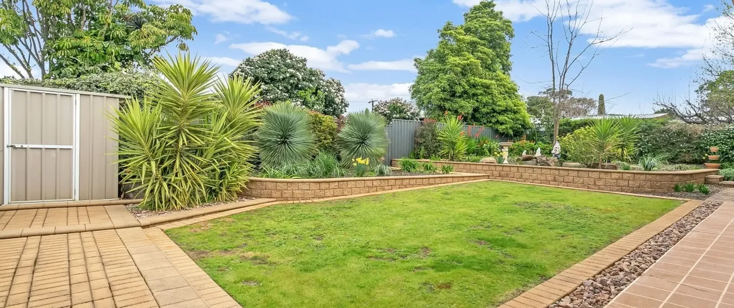 - Fully fenced, manicured rear yard with garden shed