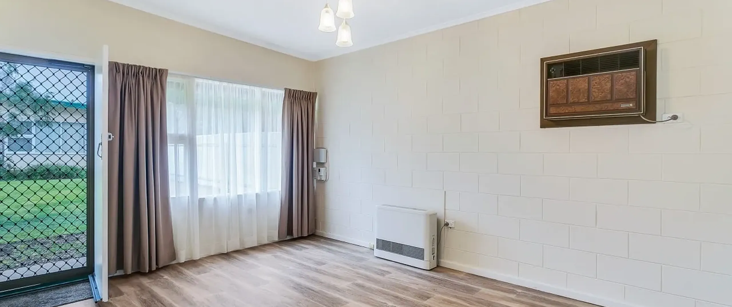 - Light filled living room with brand new gas heater and wall mounted reverse cycle air conditioner