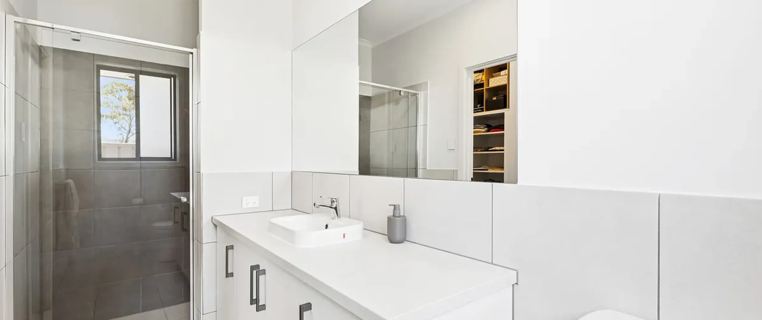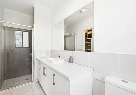 - Generous main bedroom with walk-in robe and contemporary ensuite featuring oversized shower, vanity with ample storage, and toilet