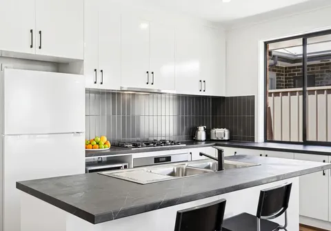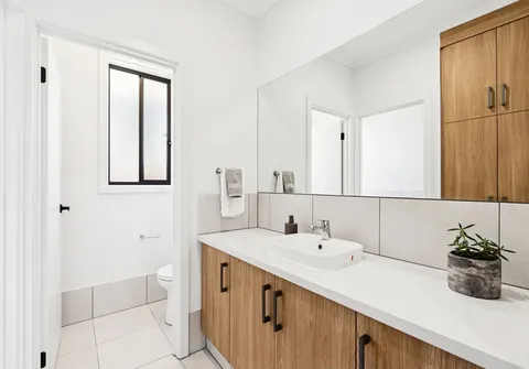 At its heart, a sun-filled open-plan kitchen, living and dining space flows seamlessly to the outdoor alfresco, creating a warm and inviting space where meals, playtime and relaxation come together. A stylish focal point and true family hub, the kitchen boasts marble-look benchtops, a double stainless steel sink, 5-burner gas cooktop, oven, dishwasher, breakfast bar, and a hidden walk-in pantry for effortless storage and practicality.