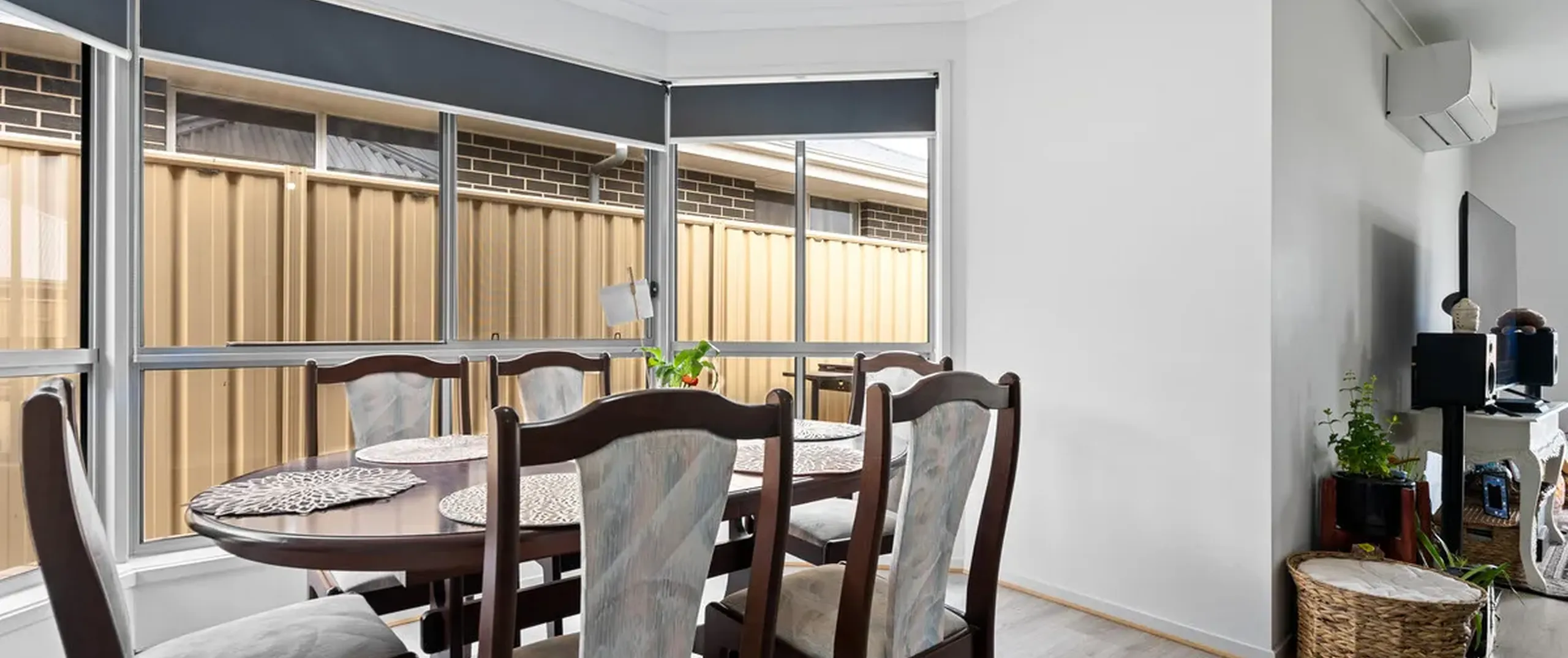 - Light-filled living and dining room with stunning bay window and split system air conditioner