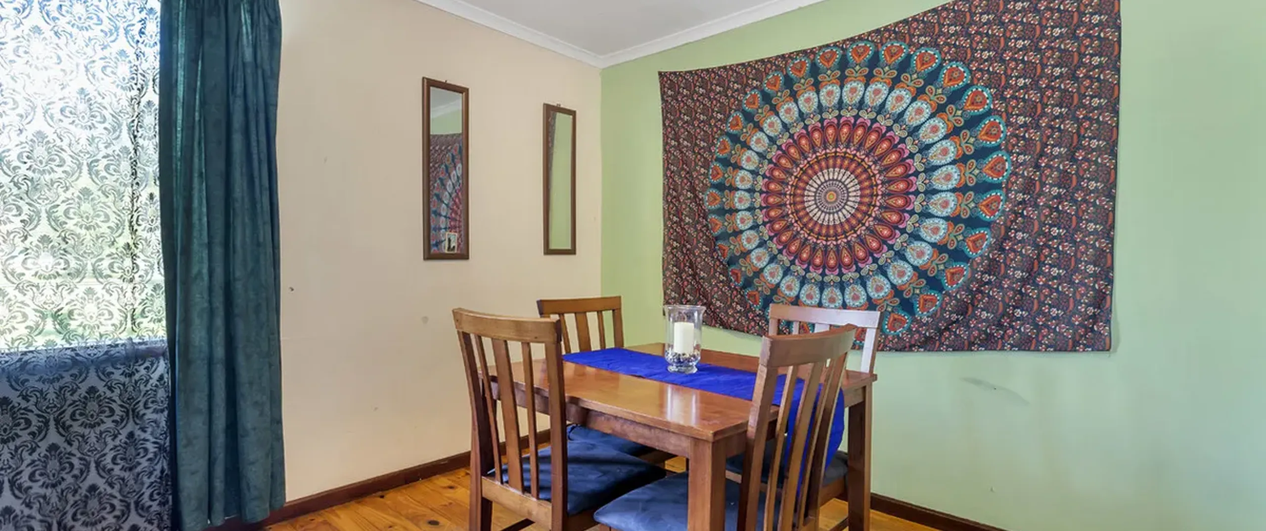 - Light filled living and dining room with heater, air conditioner and ceiling fan