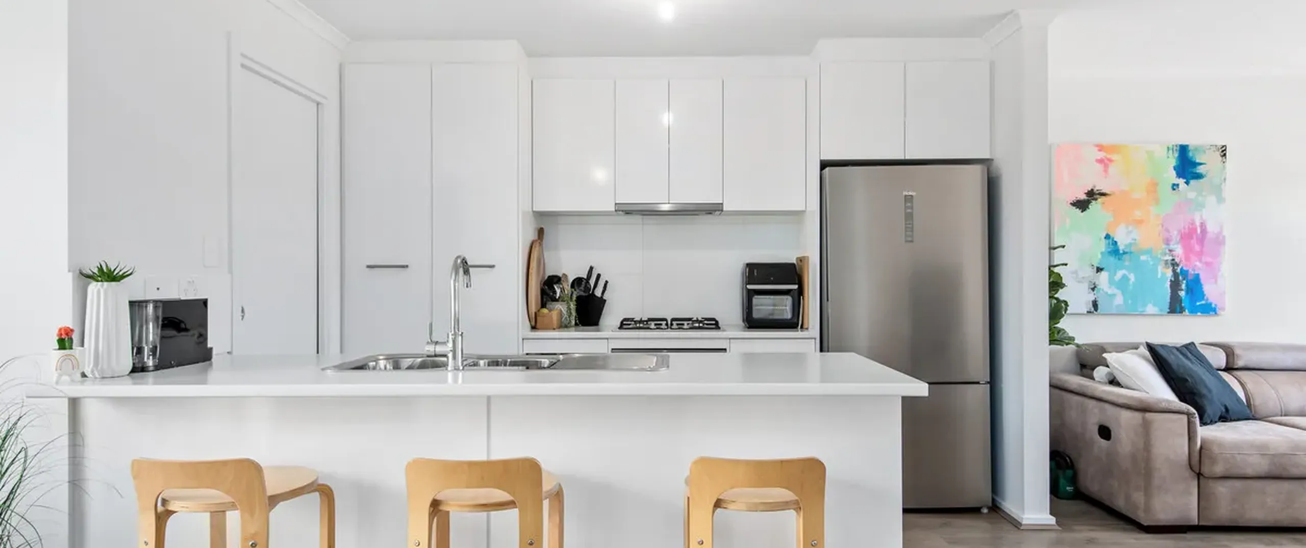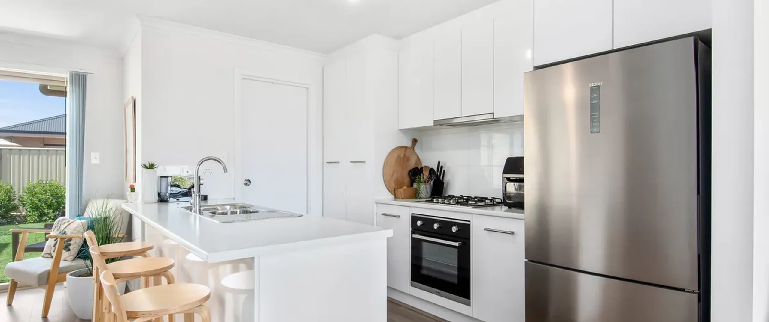 - Modern white kitchen with dishwasher, gas cooktop, pantry, ample cupboard and bench space, featuring a breakfast bar for those mornings when time is of the essence