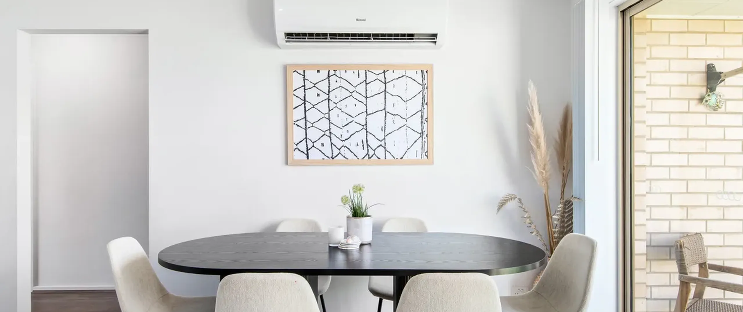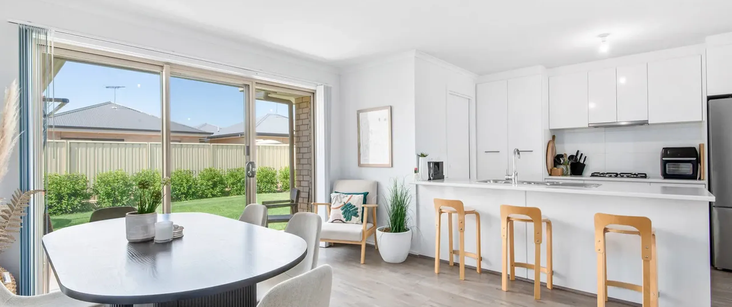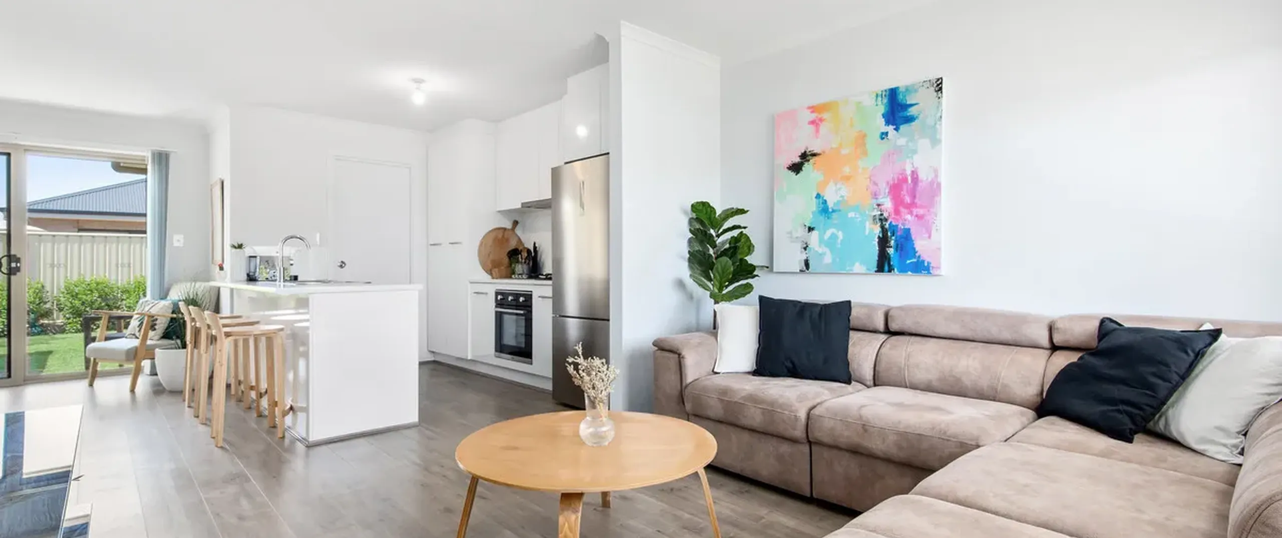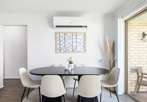 - Open plan kitchen, living and dining with a split system air conditioner and direct access to outdoor area